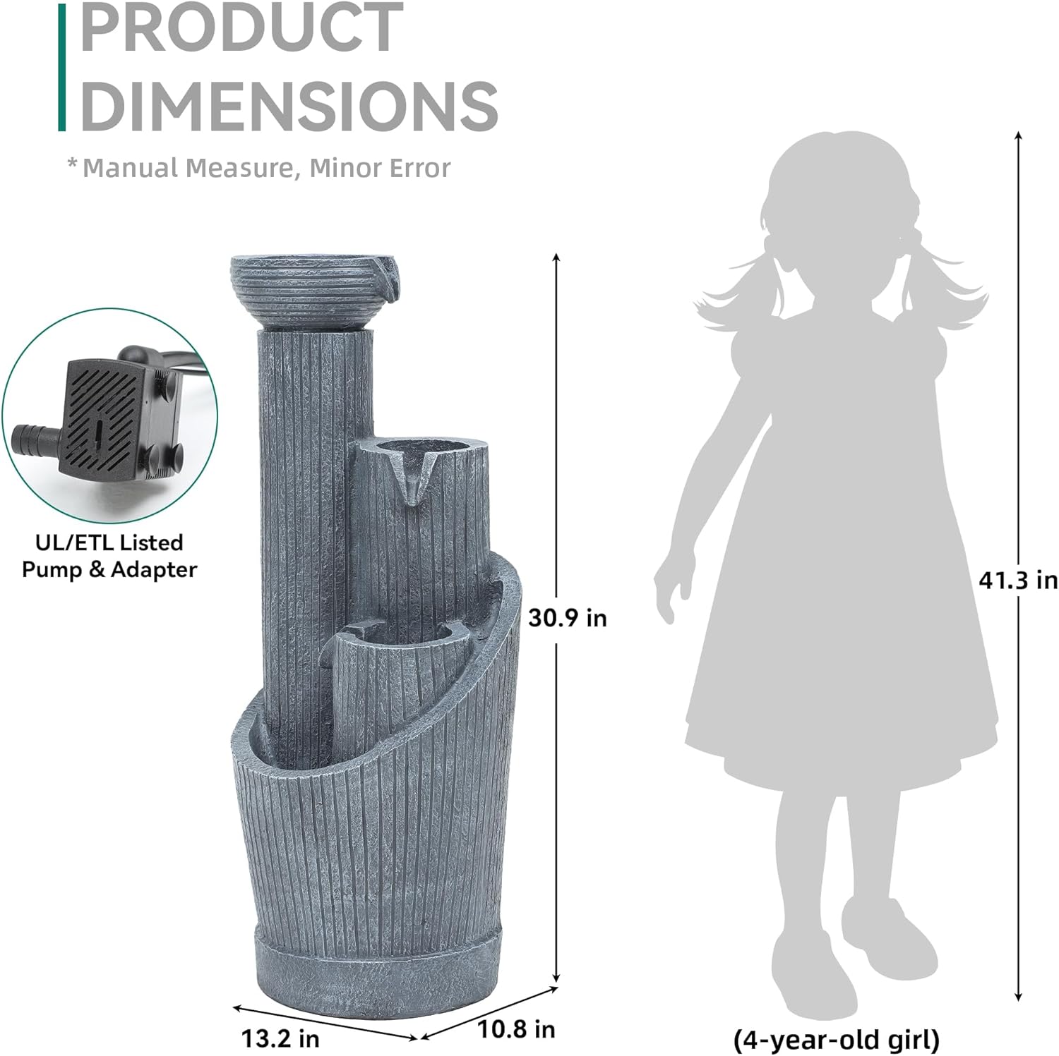 - Easy & Safe Use🔌: This freestanding floor water fountain Includes a ETL/UL-listed pump and a standard 6ft power cord. Quick and easy setup, just add water, plug it in, and enjoy. Designed for safe outdoor use.
