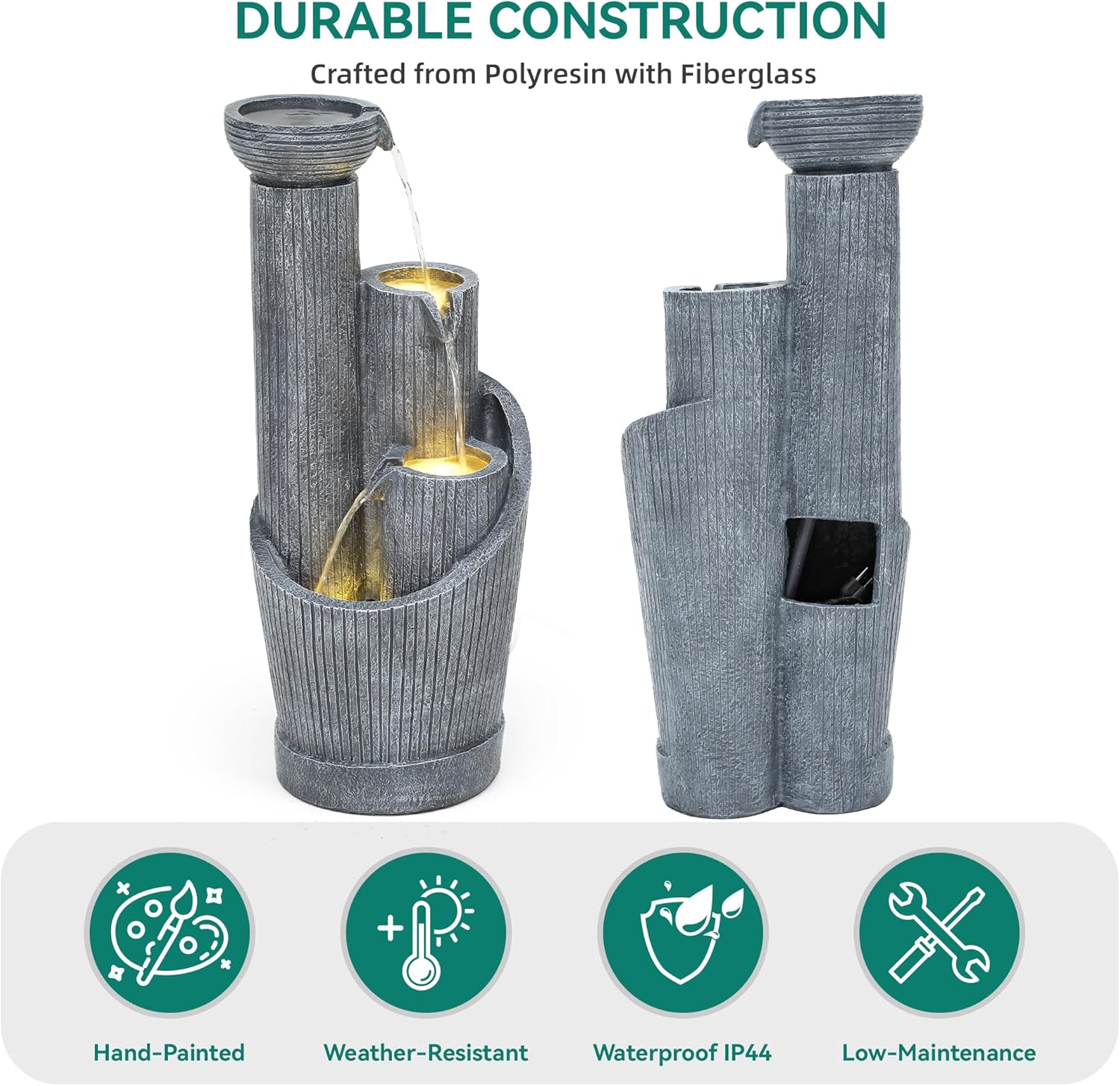 - Weather-Resistant Resin Build⛅: Crafted from well-made resin and fiberglass with a handcrafted finish and textured details, this outdoor garden fountain is built to resist weather, rust, and scratches, ensuring year-round beauty with minimal upkeep.