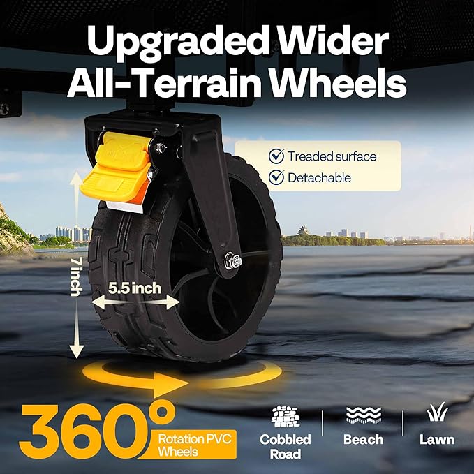 - ALL-TERRAIN WHEELS & SECURE BRAKING - Conquer any terrain with 7" PVC wheels. Deep tread provides superior traction on grass, gravel, and sand, making this a reliable double decker beach wagon. Features detachable wheels and a built-in brake for safety on slopes
