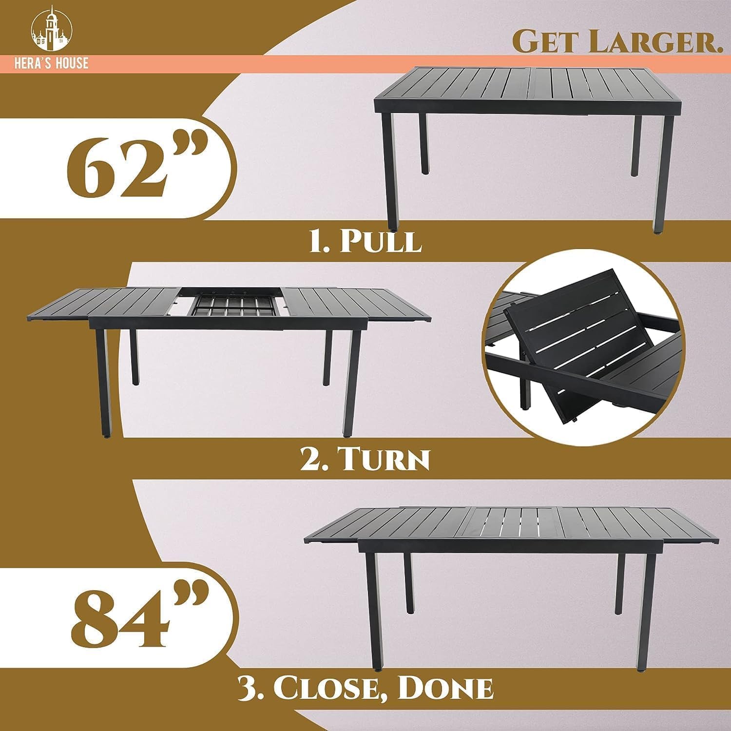 - 【62"/84" MORDEN EXTENDABLE SLATTED METAL TABLE TOP】Large rectangle surface for 6-8 person, enough space for your leisure time with your friends or family. HERA’S HOUSE slatted metal table top leaves enough water seepage gaps, which is easy to clean and won’t accumulate water. Expandable table top with 2 sizes (62" and 84") meet your actual needs.