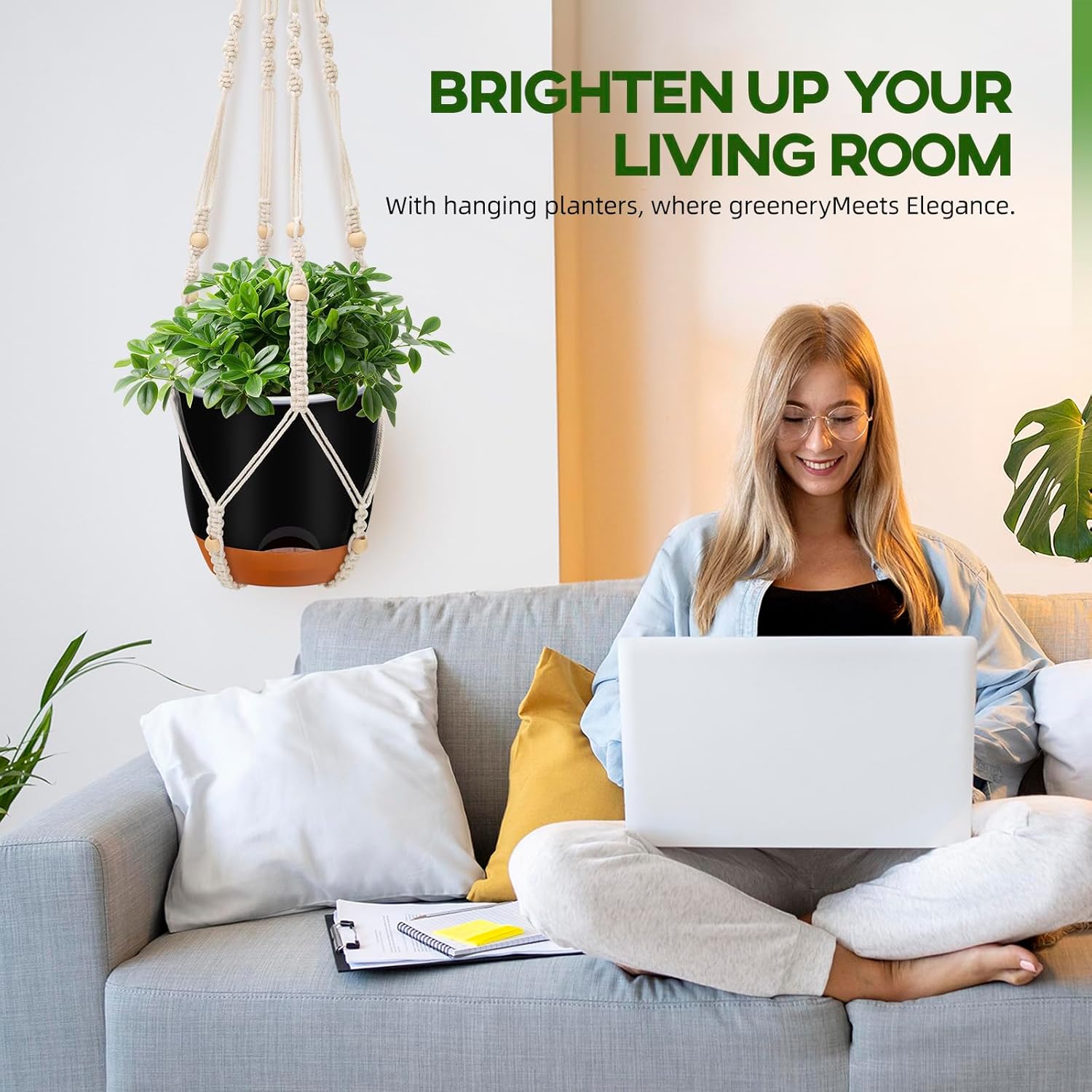2-Pack Self-Watering Hanging Planters for Indoor & Outdoor Plants,34-Inch macrame hanger plant pots indoor with drainage,5.7-Inch Small Hanging Planters & Baskets in Black,With two sets of hooks