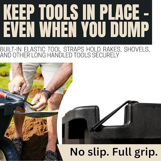 - HEAVY-DUTY REAR DUMP MECHANISM FOR CONTROLLED UNLOADING – Engineered for efficiency, the rear dump design allows for easy, controlled unloading of heavy loads without tipping or struggling. Ideal for dumping mulch, gravel, soil, and debris exactly where you need it—perfect for landscaping, farming, and construction tasks.