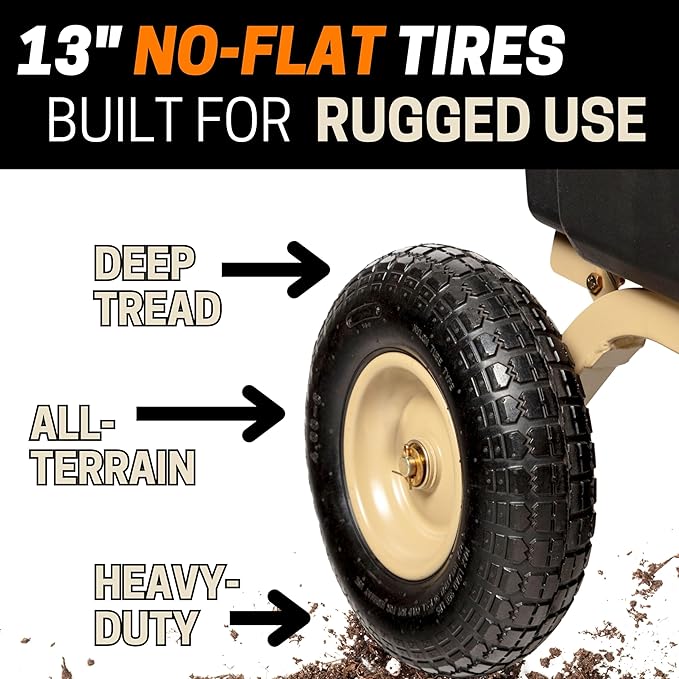 - ALL-TERRAIN 13” NO-FLAT WHEELS WITH STEEL RIMS – Designed for smooth maneuverability, the heavy-duty no-flat tires absorb shock and provide excellent traction on dirt, gravel, sand, grass, and uneven terrain. Whether used as a yard cart, beach wagon, or garden cart on wheels, this all-terrain utility wagon is ready for any hauling job.