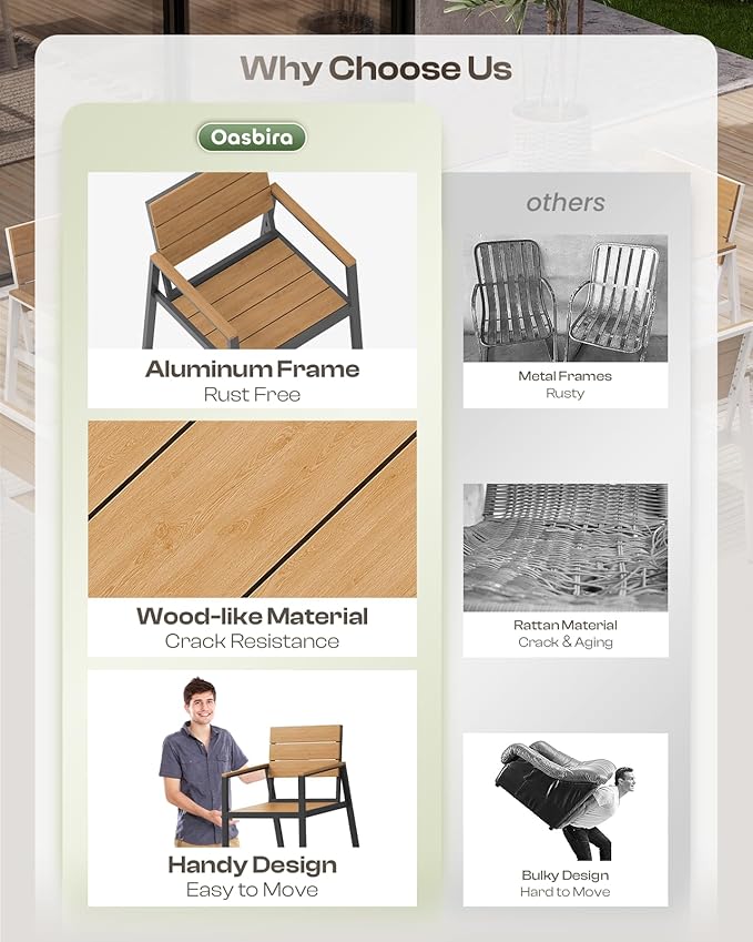 - 【Premium Materials】This patio dining set features an aluminum frame with weather-resistant coatings, which make it lighter and stronger than iron. Also, its HDPS wood-like panels are UV-resistant and fade-proof, ensuring long-lasting beauty. Compared to conventional metal furniture, Oasbira outdoor dining sets are more sturdy and ideal for outdoor use.