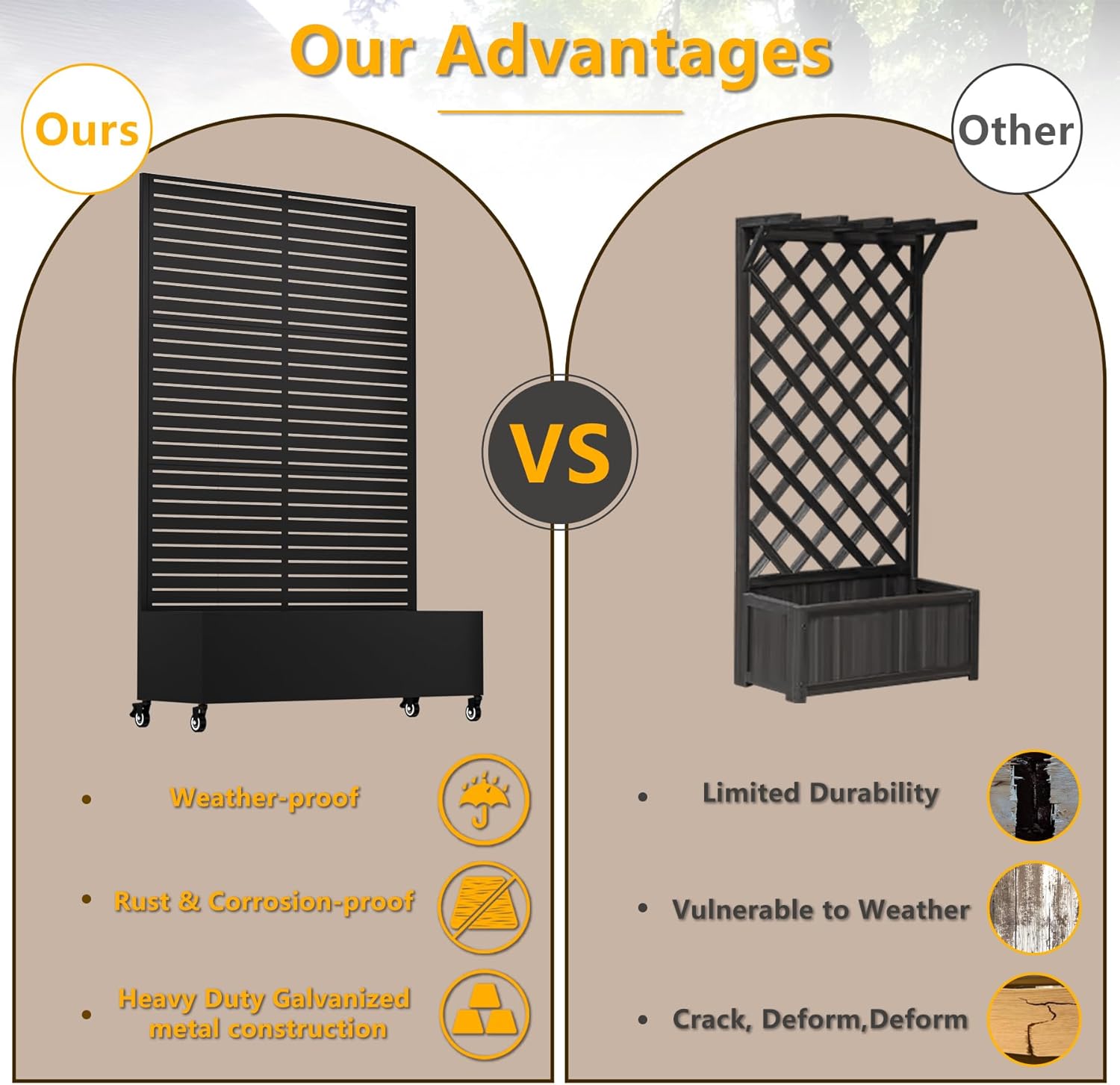 - 【3-in-1 Metal Planter Box with Trellis】This 72-inch tall metal planter box with trellis serves as an elevated garden bed for flowers, vegetables, and fruits, a sturdy support for climbing plants, and a stylish privacy screen to enhance any patio, lawn, or garden space. Perfect for versatile outdoor planting and decoration.