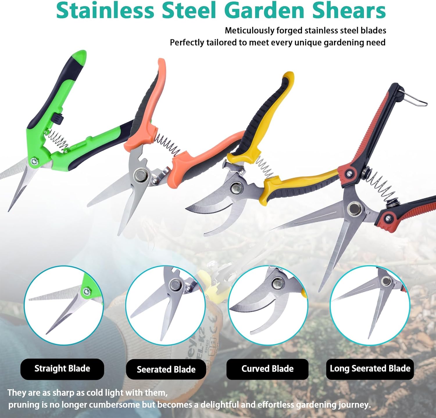 - 4 Blades, Endless Uses: Our pruning shears set include 4 kind of different blades for a variety of general pruning work: straight for branches, micro-tip for basil, curved for hedges, serrated for fibrous stems. Meet a variety of daily needs.