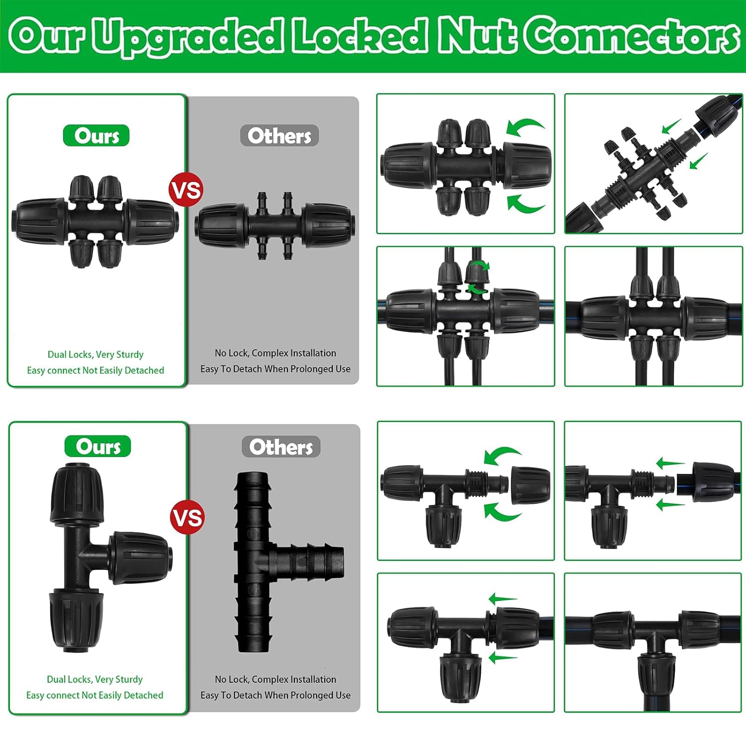 - Upgraded Quick Connect Design, Efficiency Boost: The 4-way connector, tee, and emitter of our garden drip irrigation system feature upgraded locked nut design, make them easy to connect with 1/4" irrigation tubing; what's more, the 360° tight structure of these dual locked nut ensures pipes stay firmly locked, resistant irrigation tubing loosening or detachment when dripping, sprinkling, misting, even in high-pressure water, ensure the garden irrigation system working well in any time and any place.