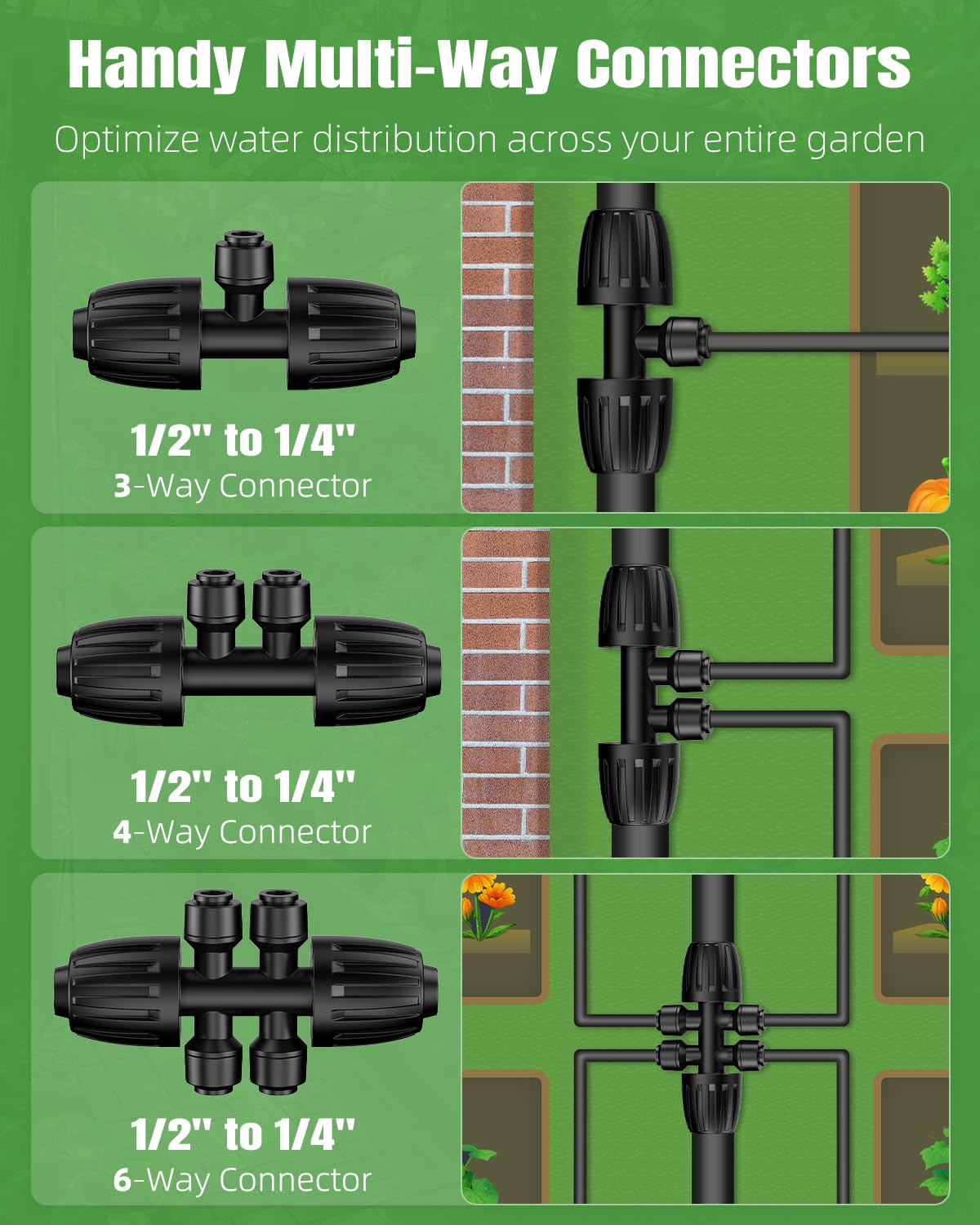 - Quick-Connect DIY Irrigation Kit: Featuring a quick-connect design, the multi-port fittings in this drip irrigation system allow for instant connections and adjustments. Optimize water distribution across your entire garden and saves 80% Installation Time!