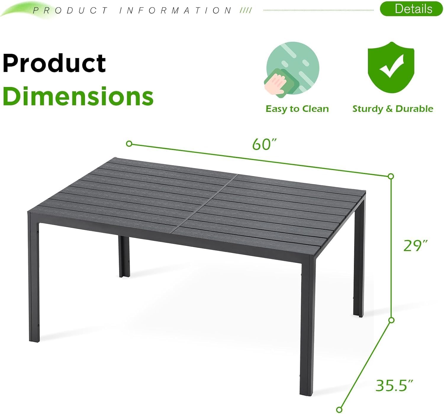 - EASY ASSEMBLE:Normally this outdoor dining table required 10-15 minutes to assembly by one person,just needs to put the parts together and then fix them with screws.TABLE DIMENSION:59’’(L) x 35.5’’(W) x 29’’(H)