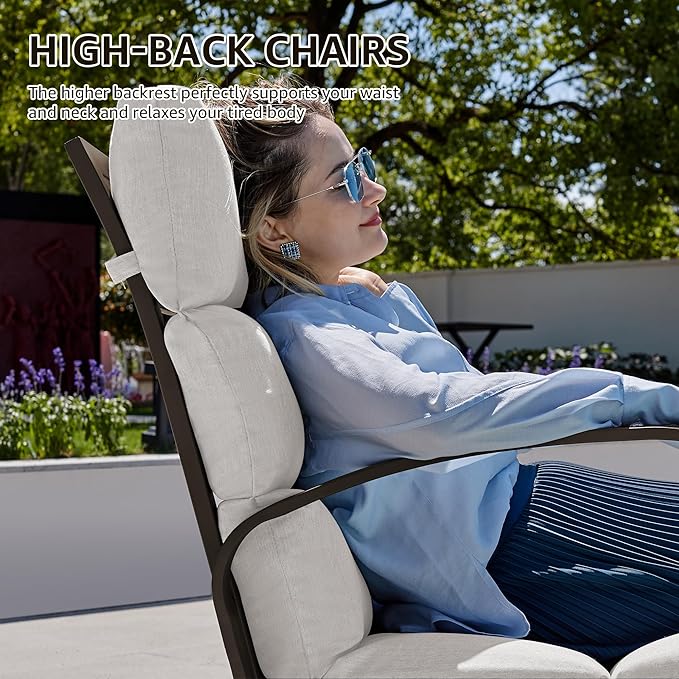 - 【5 Inch Seat Cushion & Premium Olefin Fabric】The patio rocker comes with soft cushions that are 5 inches thick and filled with high-density foam. Seat cushion is very comfortable for you to rest and it can be firmly fixed to the chair by Velcro fasteners. The cushion cover is made of high quality Olefin fabric,which is breathable and fade resistant,it is better than normal polyester fabric
