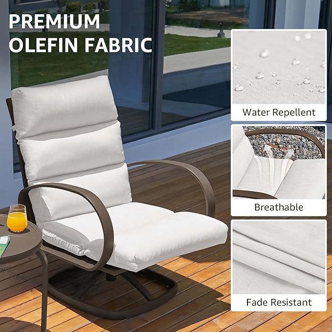 - 【Modern Unique Decor】This patio bistro set is designed to be modern and stylish,provide you a comfortable experience. The balance design of the rocking swivel chair is very good. Gently shake or rotate 360 degrees back and forth. Sway quietly to better relieve fatigue and stress, your family and friends could sit on the rocking swivel chair set and enjoy leisure time with you happliy.