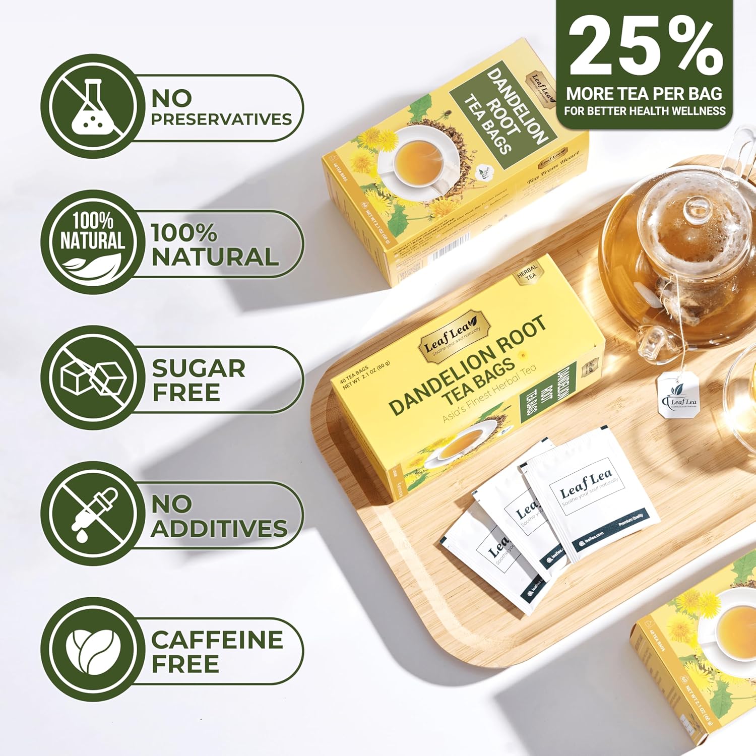 - Smooth Flavor – LeafLea dandelion tea offers a naturally rich taste without added flavoring. Enjoy warm for a soothing break or serve over ice for a refreshing option. A clean, full-bodied tea experience that suits both quiet mornings and busy days.