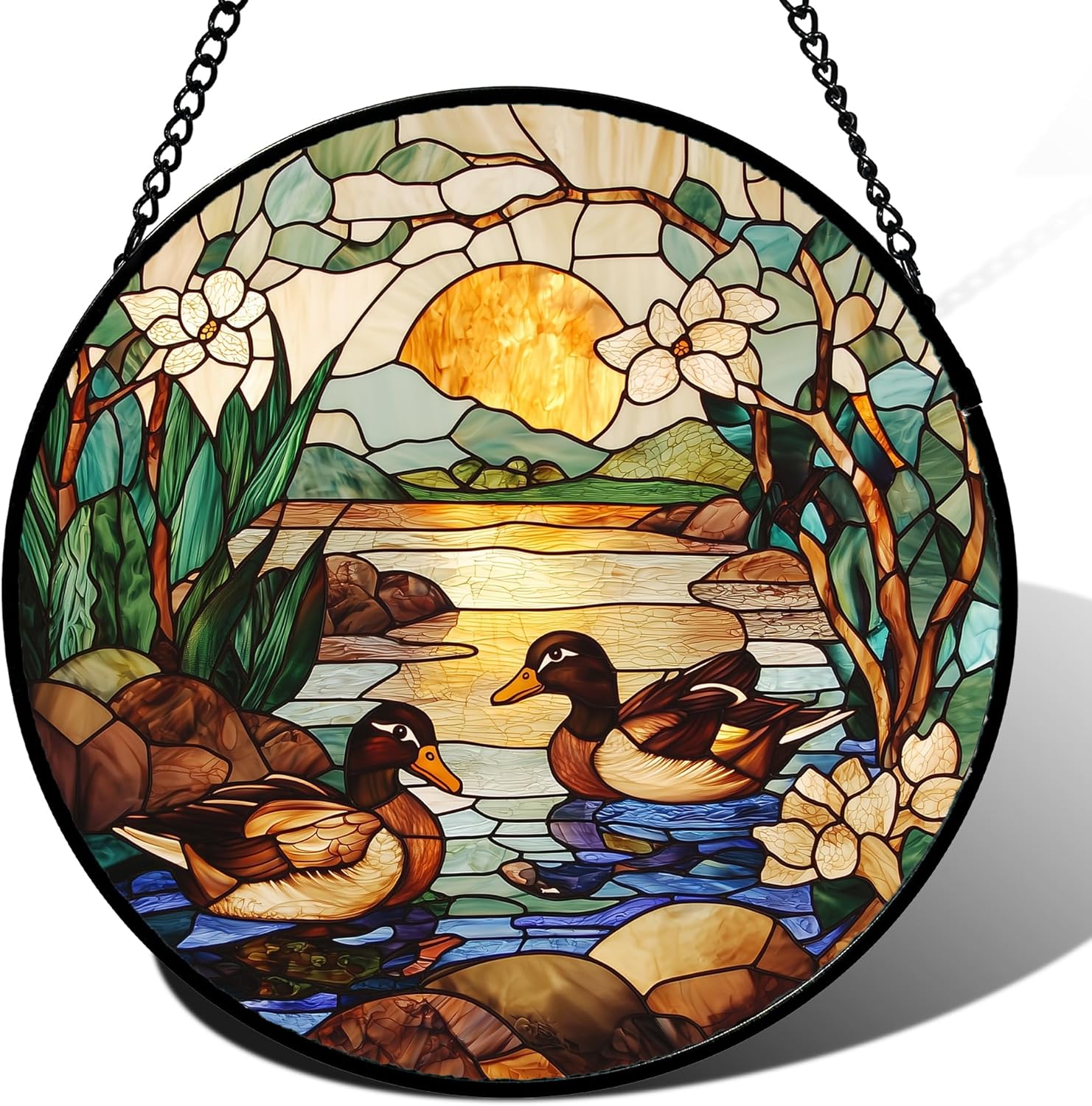 Stained Glass Window Hanging, Ducks in The Pond Sun Catcher for Door Home Decor Landscape Plant Suncatcher Christmas Mother's Day Birthday Gifts for Women Men Mom Nana 11.8 in