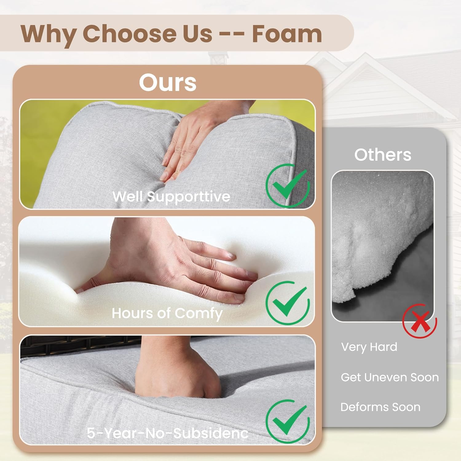 - Texture Woven Fabric: Cushions are covered by yarn dyed woven fabric, the yarns are dyed and UV treated before woven into fabric for out door fading resistant and water repellent. Looks and touches with high-end woven texture. No more worry about getting cheaply made thin print fabric. Detachable & washable