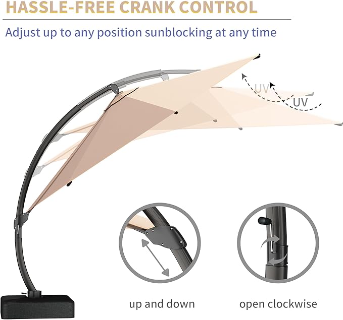 - 【360° Rotation & Infinite Tilt for Full Sun Control】Maximize shade coverage with smooth 360° rotation and precise infinite tilt adjustment. Easily block sunlight from any angle—perfect for poolside relaxation, patio dining, or backyard gatherings.