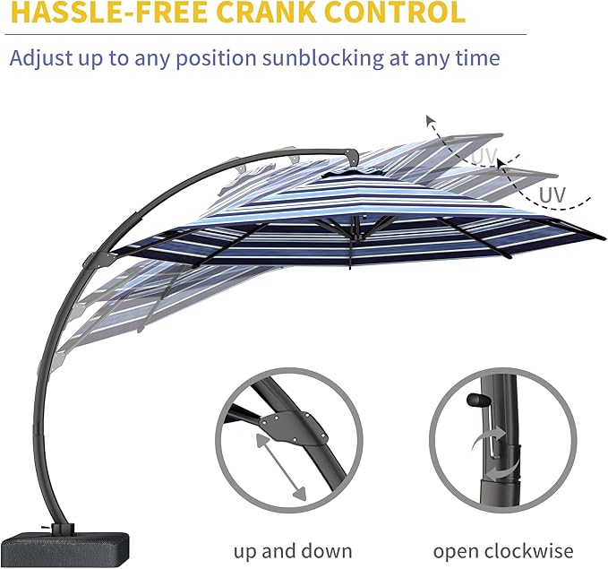 - 【360° Rotation & Infinite Tilt for Full Sun Control】Maximize shade coverage with smooth 360° rotation and precise infinite tilt adjustment. Easily block sunlight from any angle—perfect for poolside relaxation, patio dining, or backyard gatherings.