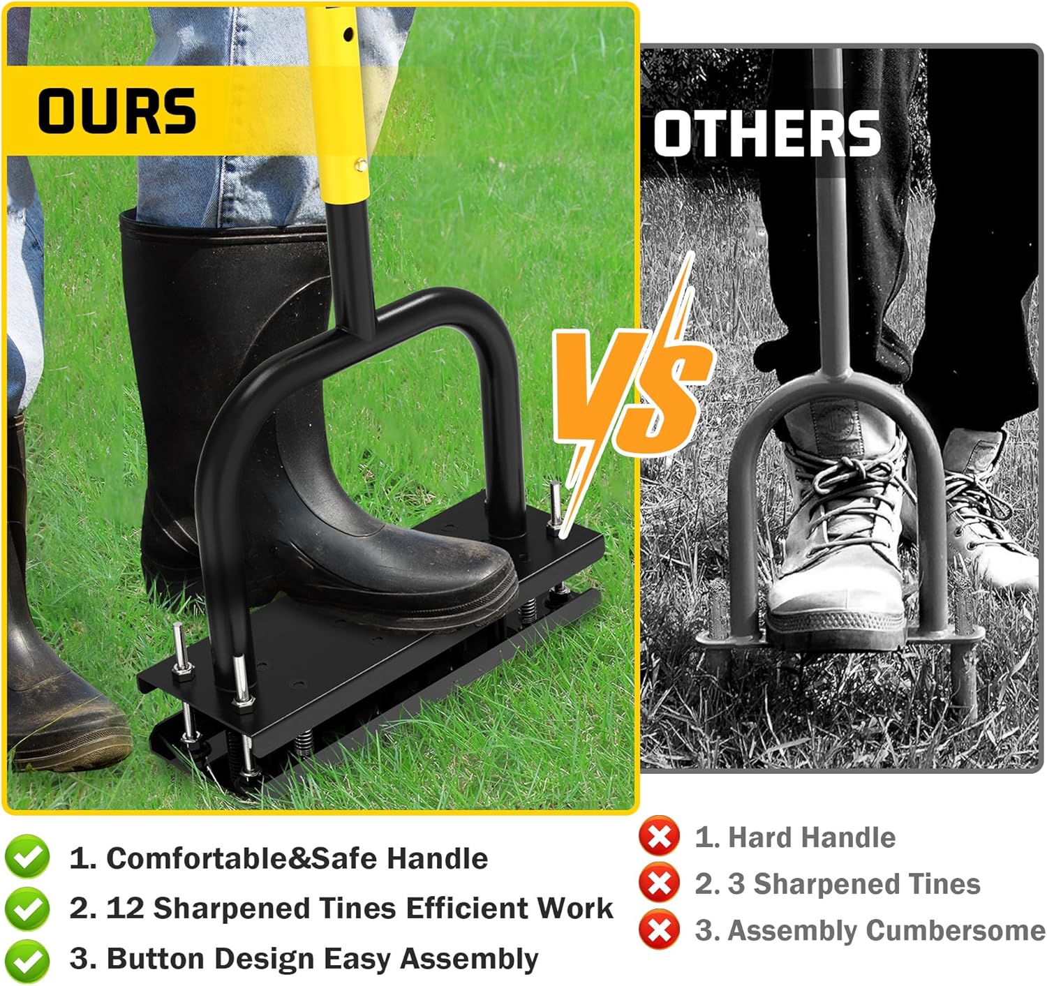 - 【Efficient Manual Lawn Aerator】The lawn aerator penetrates the soil with iron spikes so that it can be easily inserted into the ground, loosening the soil, effectively solving soil problems, improving drainage and air circulation, allowing water, oxygen and nutrients to easily reach the roots of the plants, and helping the planted plants and grass seeds to breathe and grow better