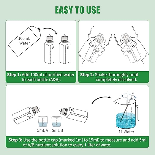 - Precision Feeding with Easy-to-Use Formula: Simply mix 5ml each of A & B hydroponic nutrients per 1L water. The included dosing cup ensures accurate measurements. This hydroponic nutrient solution dissolves instantly, eliminating guesswork for beginners and experts alike.