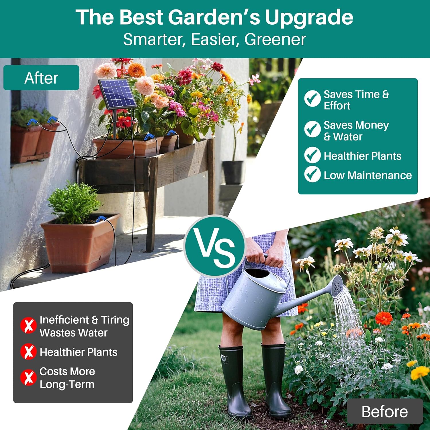 - Solar Drip Irrigation System Outdoor: The smart solar system with built-in 2200mAh battery automatically switches between solar and battery power, ensuring reliable watering day and night - no electrical outlets needed! Perfect for remote garden beds, balconies, and eco-conscious gardeners looking to reduce their carbon footprint