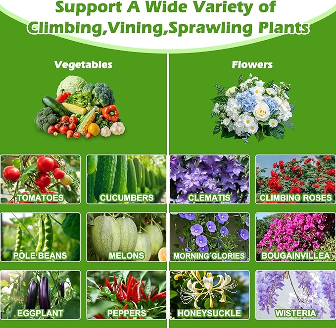 - Rustproof Steel Frame to Last Through Seasons: Crafted from heavy-duty, powder-coated steel, this trellis is rust-resistant and weatherproof, ensuring it stands tall through sun, wind, and rain. Unlike wooden trellises that may rot or plastic frames that warp, this metal structure offers lasting durability for year-round use