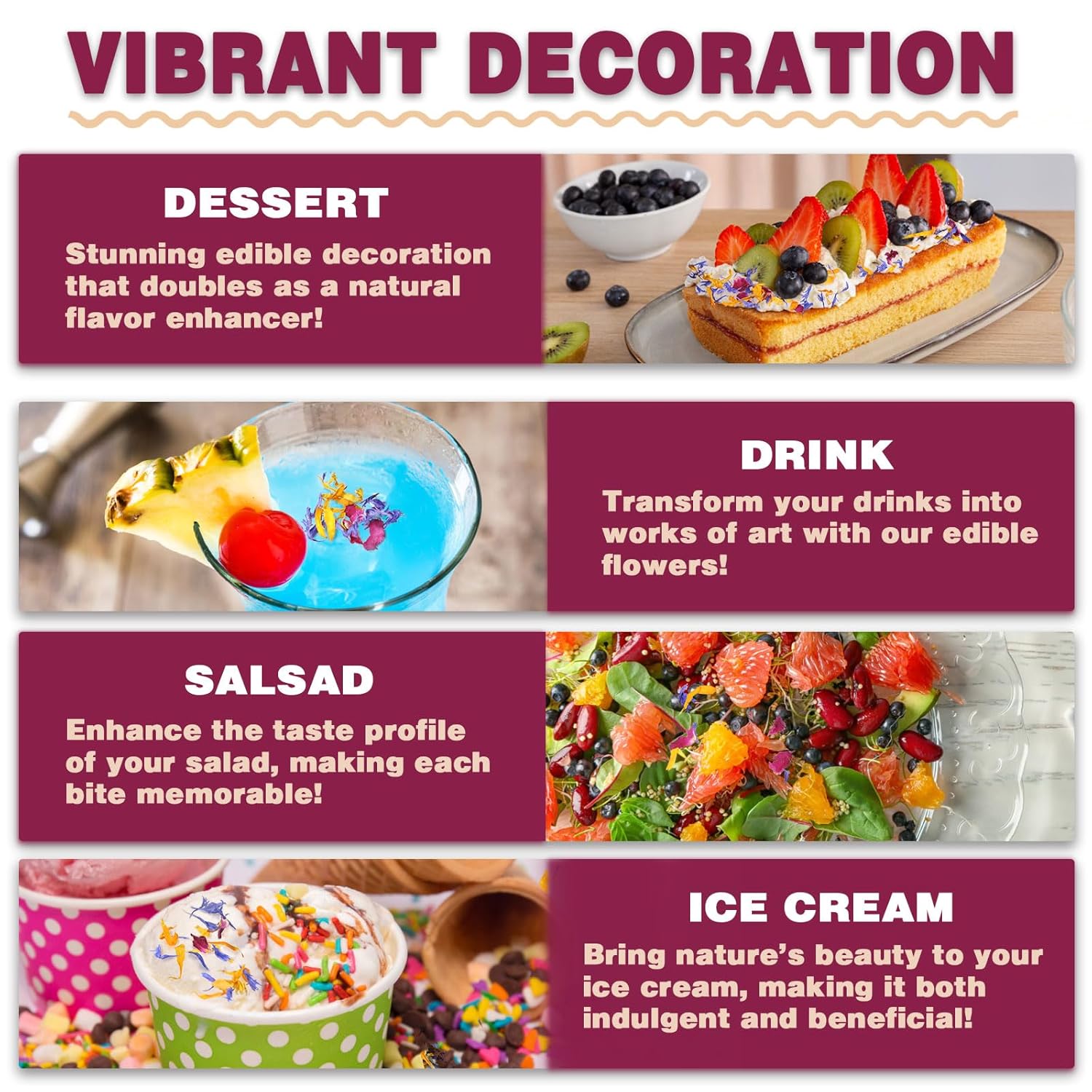 - Gourmet Versatility: Elevate your dishes to a new level of sophistication! These edible flowers are perfect for decorating cakes, salads, drinks, and ice cream. A simple sprinkle adds an instant burst of vibrant color and a delicate floral fragrance, transforming ordinary recipes into visually stunning, aromatic masterpieces.