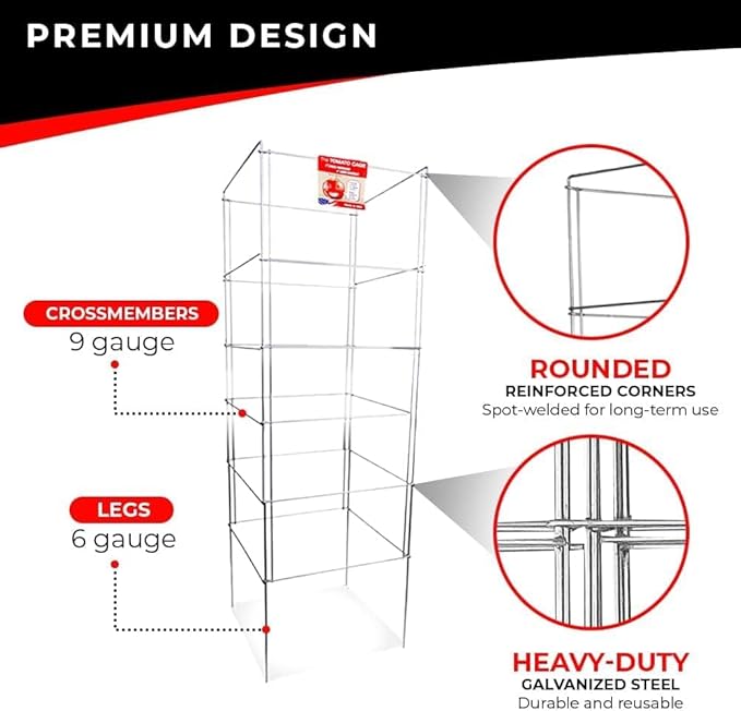 - DURABLE AND STABLE BUILD: Constructed from galvanized steel with 6-gauge (4.1 mm) legs and 9-gauge (2.9 mm) cross members, this cage is built to last. The sturdy frame resists rust and holds up under the weight of heavy or fruiting plants.