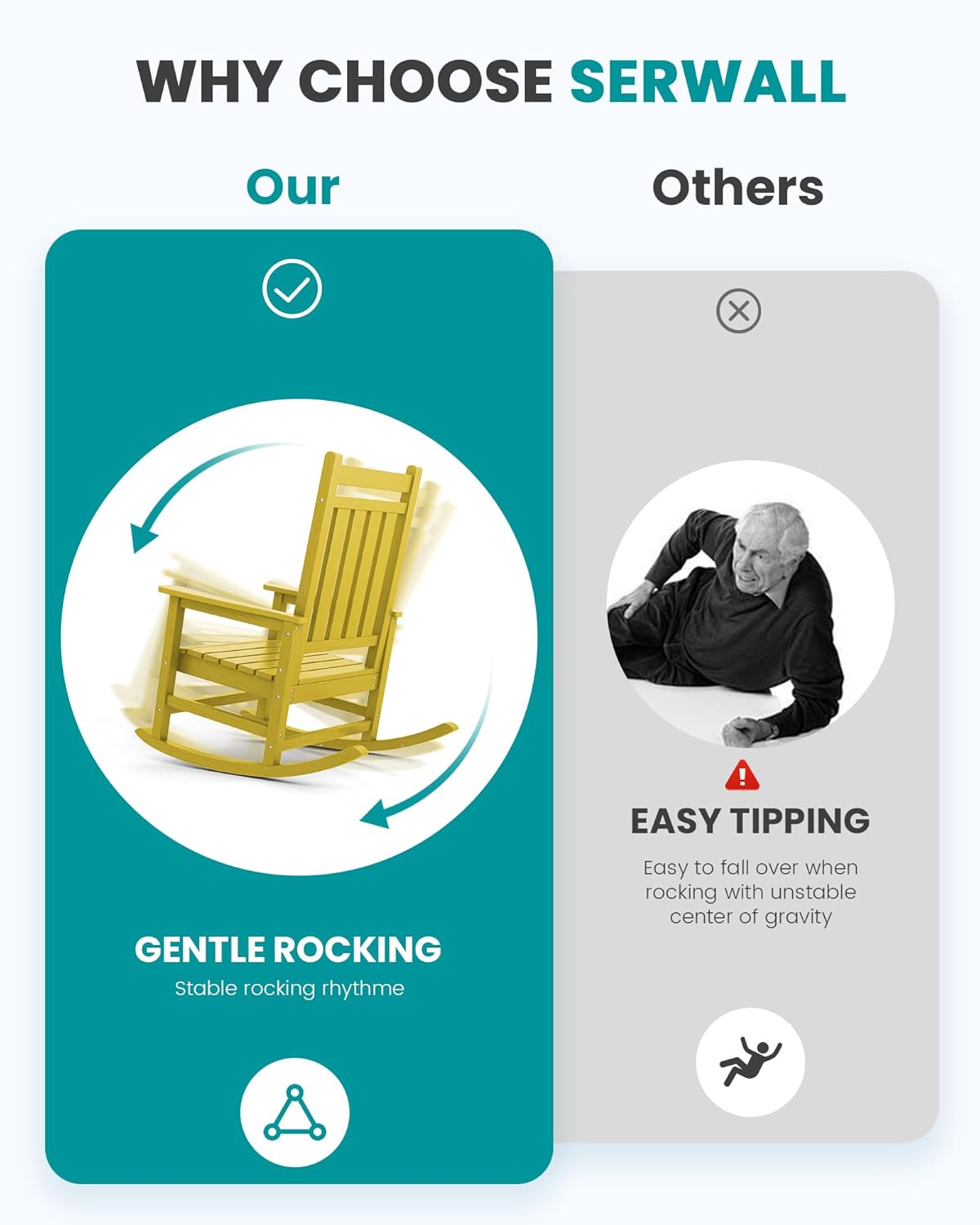 - Details Make It Successful: This porch rocker features an ergonomic curved backrest—unlike traditional straight-back designs—providing superior reclining comfort. With wide armrests and a contoured seat, the SERWALL rocking chair alleviates fatigue. (Tip: Pair it with our cushion [ASIN:B0D7Q1V8ZC] for added comfort.)