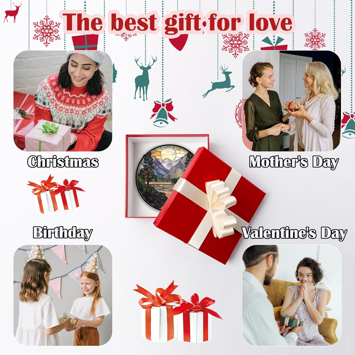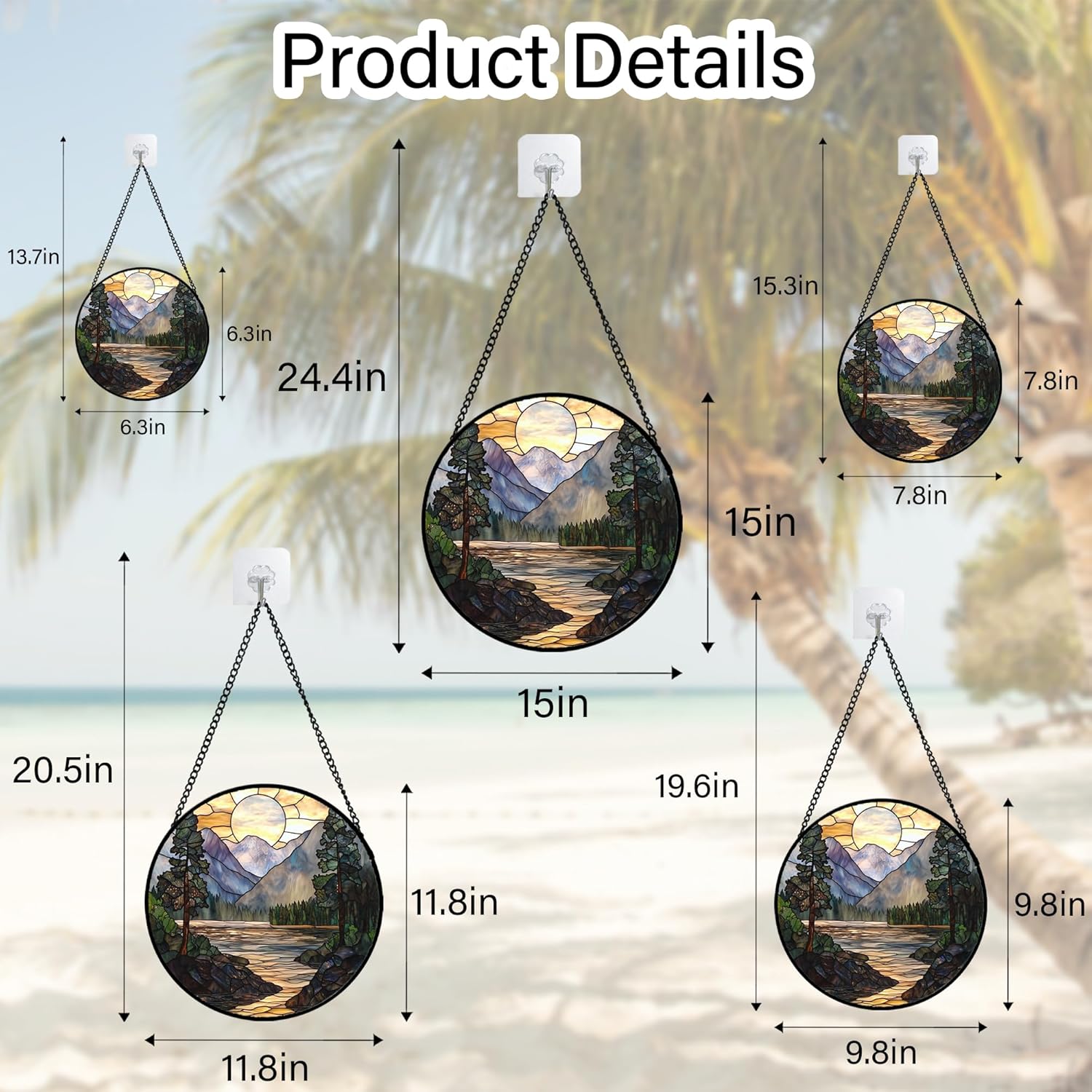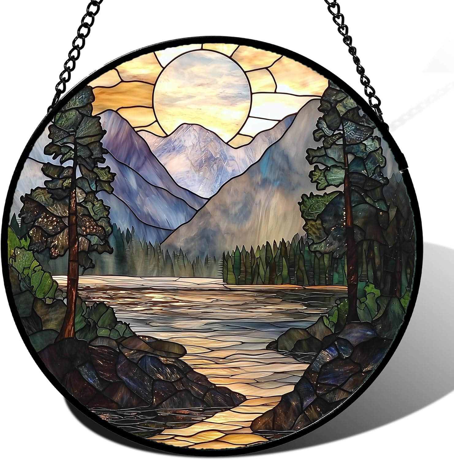 Stained Glass Window Hanging, Sunset Mountains Lake Tree Sun Catcher for Window Home Decor Landscape Suncatcher Mother's Day Birthday Gifts for Women Men Mom and Nana 9.8 in
