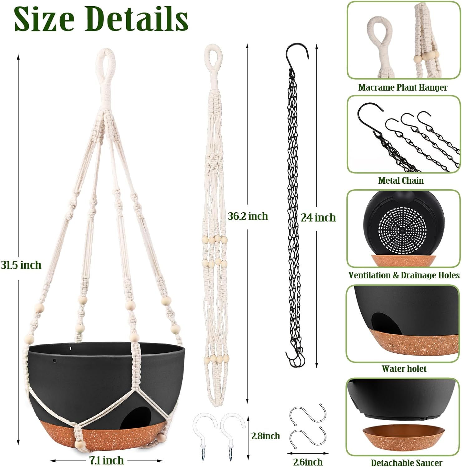 - 【Two Types of Plant Hangers】Our indoor plant hanging pots come with both metal hooks and cotton rope hangers, offering versatile solutions for different environments. The metal hooks are designed for outdoor use, built to withstand wind, rain, and sun exposure, ensuring long-lasting durability in harsh weather. The bohemian-style cotton rope hangers add a touch of elegance to indoor spaces, creating a cozy and stylish atmosphere for your plants.