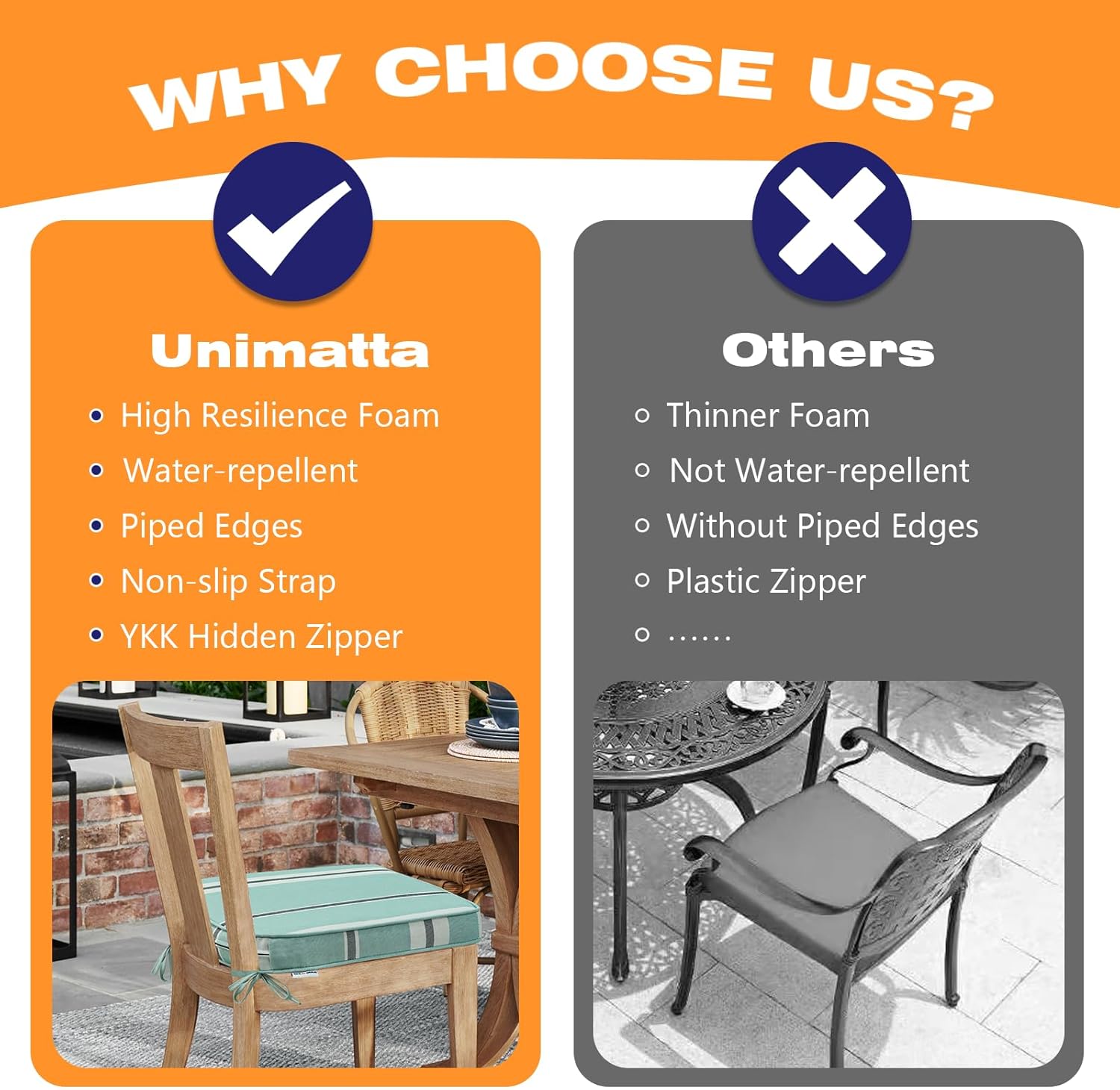 - 【High Resilience Foam】 The Unimatta chair cushions are filled with high-quality 100% foam, high-density sponge offers excellent support and long-lasing comfort. Whether you're enjoying a sunny afternoon or a cool evening, this cushion will keep you cozy.