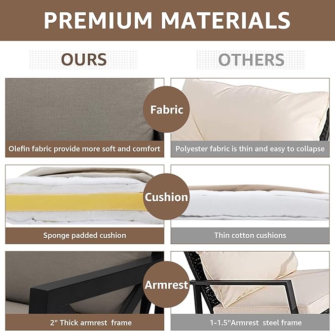 - Large Frame Size and Spacious Chairs:Chairs and tables are designed with thick and strong steel, and the width of the armrest pipe is 2 inches provide enough room to seat comfortably.Our Garden Outdoor Conversation Set have strong feet to protect your floor and increase the stability of your furniture.This outdoor furniture set can be used in the courtyard, backyard, porch, garden, poolside, balcony.