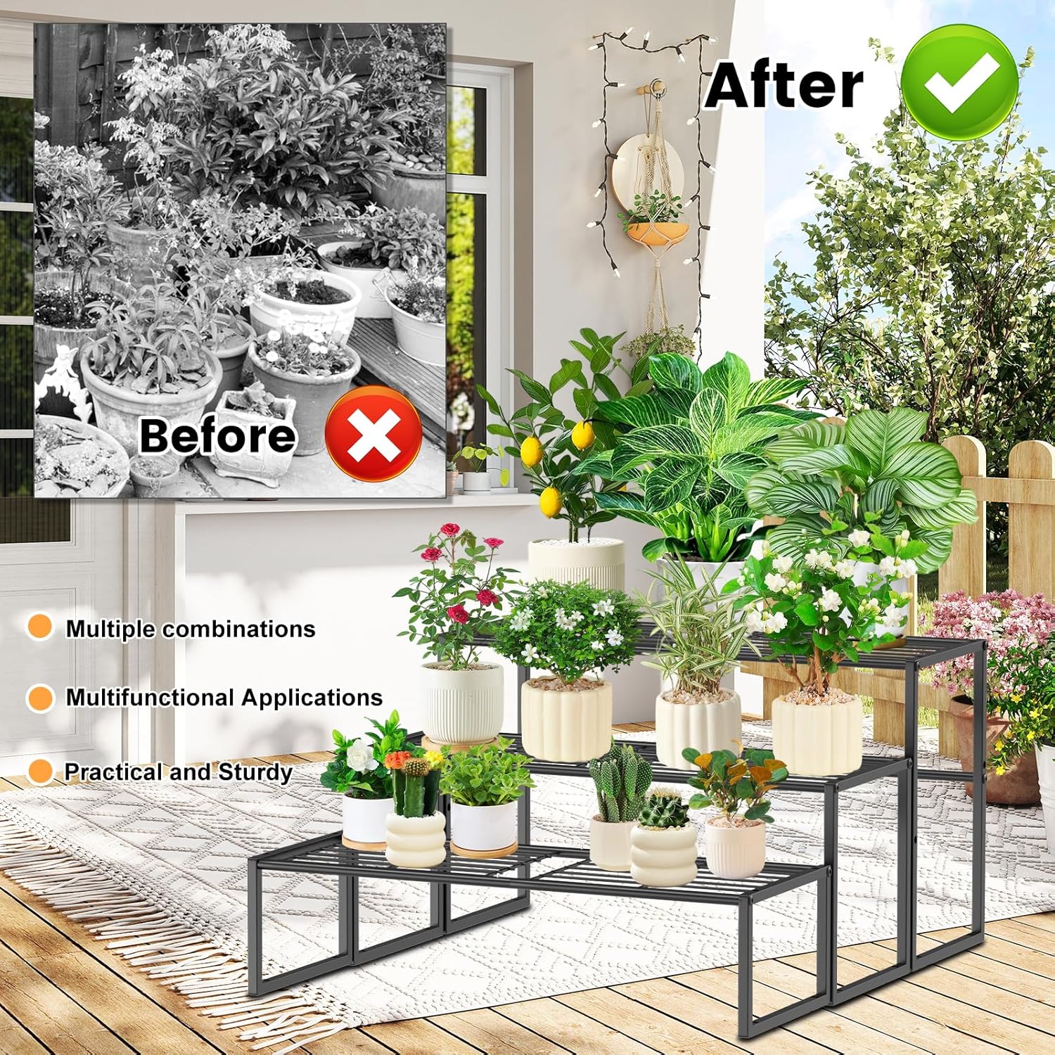 - 【Multiple Formats】 This 3-layer ladder flower stand are three display modes, single stacking or multiple product stacking, stepped shape, straight ladder shape, horizontal placement, flexible design saves space, you can adjust the height and number of layers according to your needs.