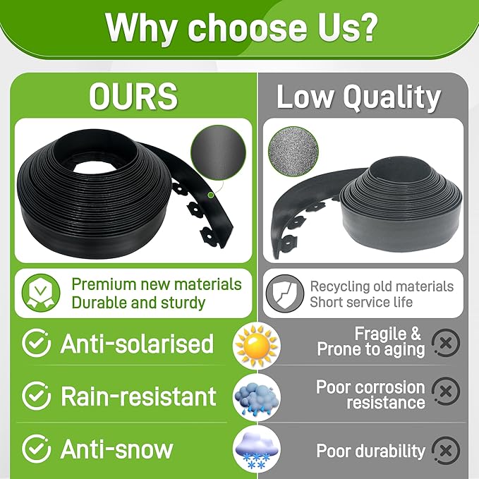 - Flexible and Durable: This plastic garden edging border made of durable PE material. It won't rust and will keep the garden looking good for a long time. Landscaping edging is easily into bends without breaking, soft material can be cut to fit your exact need. The spiral spikes are made of tough nylon, won’t rust or deteriorate, reusable, longer service life.