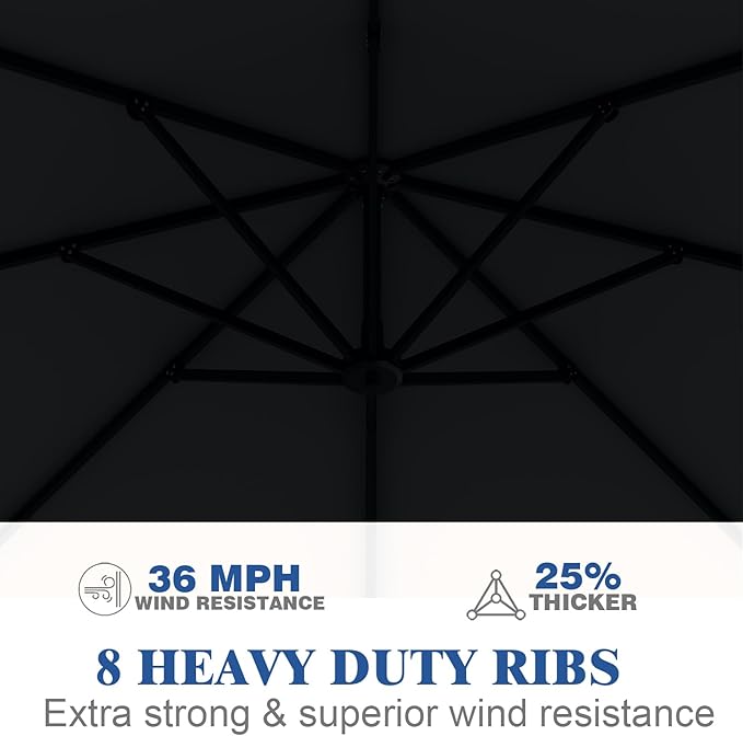 • Sturdy Steel Ribs: Enjoy unparalleled stability with our premium offset umbrella, boasting 8 heavy-duty ribs that ensure exceptional stability even in windy conditions