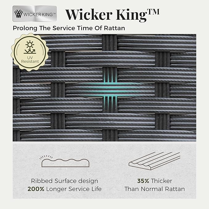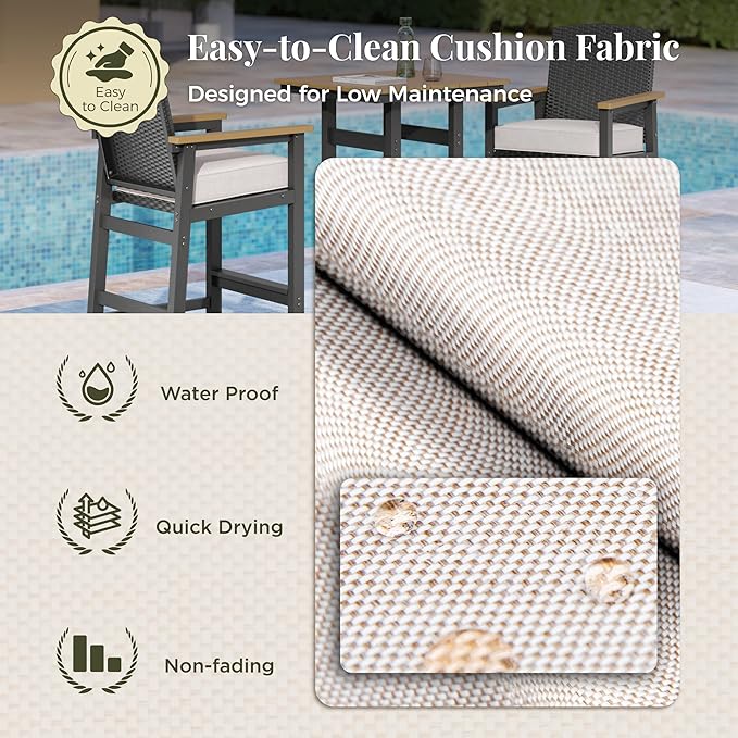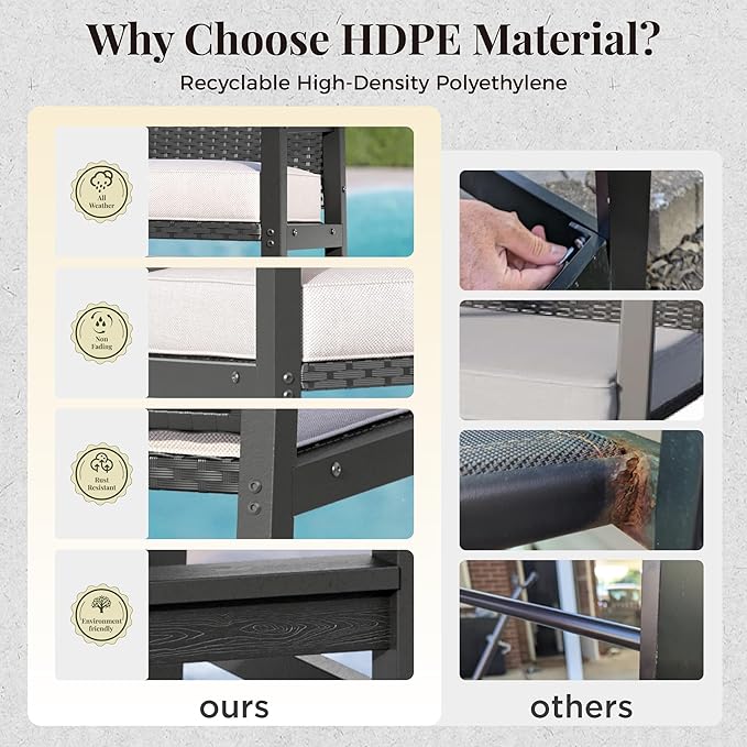 - 【All-Weather Durability】Constructed from 100% waterproof HDPE and weather-resistant rattan, this set withstands rain, sun, and humidity without rusting or warping. Unlike iron furniture that corrodes (see competitor comparison), our materials ensure years of maintenance-free use in any climate