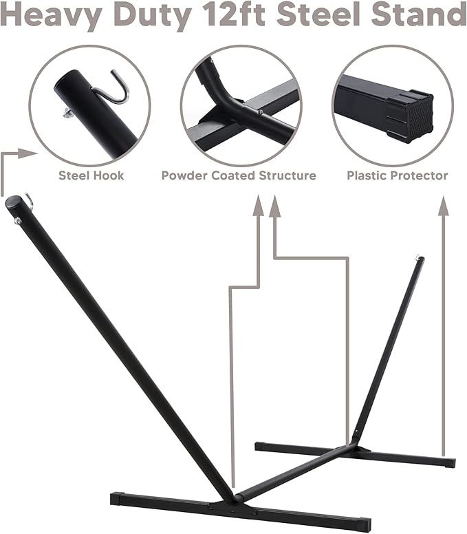- Freestanding Hammock with Portable Stand: No damage to trees. Created to be stable and long-lasting, the 12 ft stand is made from powder-coated heavy gauge steel. It can be easily assembled in minutes without any tools, and it could be disassembled easily, making it to be a portable hammock. Feel free to contact us if you have any questions during use within one year of purchase. We are always here to help