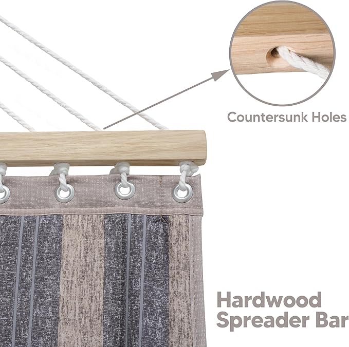 - Hardwood Spreader Bar: 55 inch hardwood spreader bars are more stylish and stable, offering you a comfy nap without the anxiety of falling down. It features countersunk spreader bar holes that reduces the friction between rope and wood