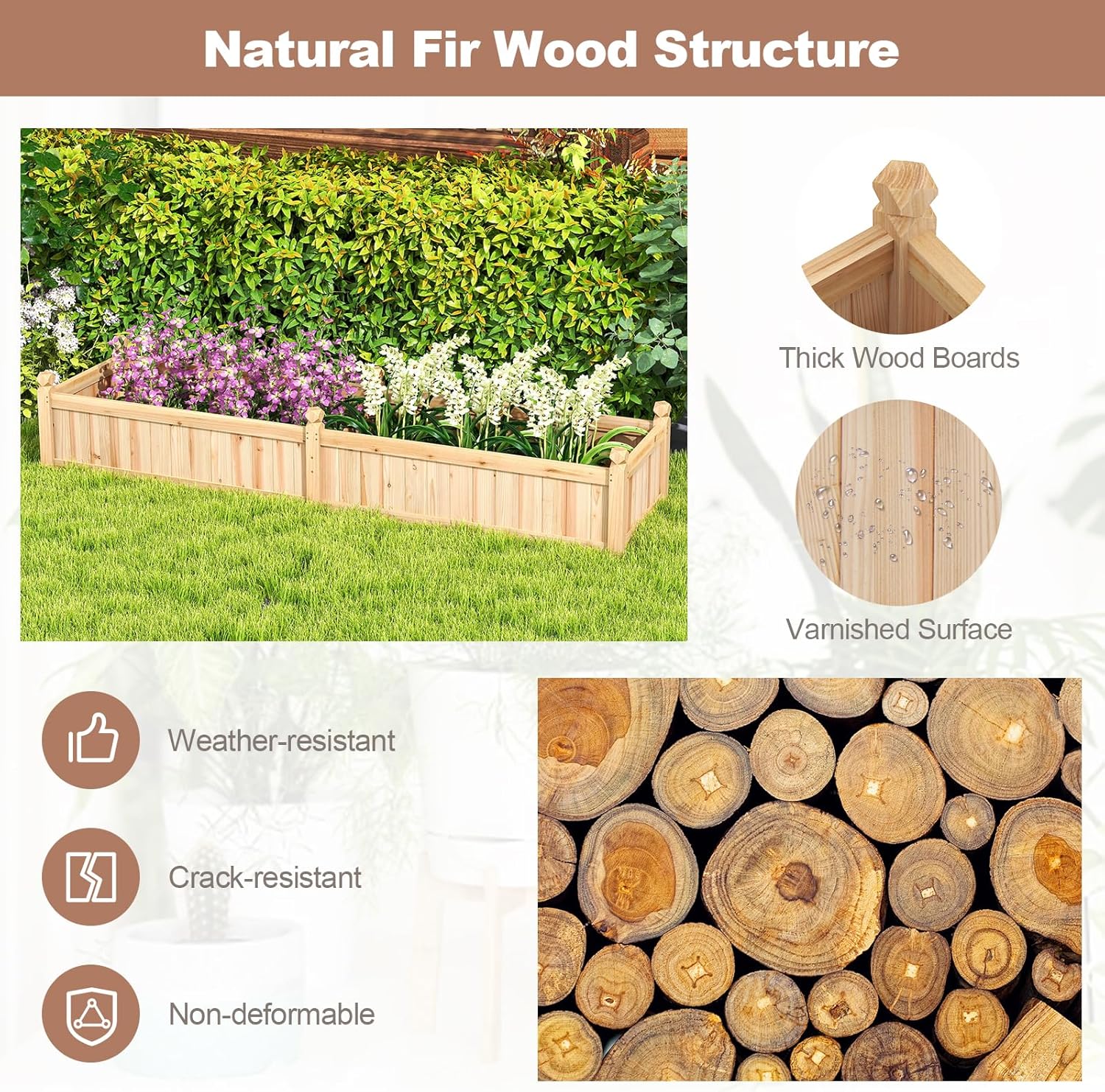 - [High Quality Fir Wood]: The planter box is constructed from natural fir wood, which is known for its strength and resistance to cracking. And the wooden surface is coated with varnish, making the planter box weather-resistant for outdoor use.