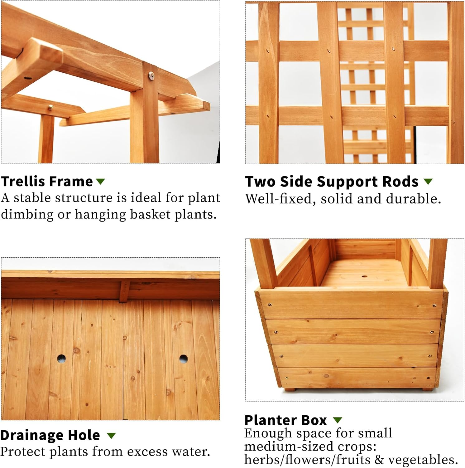 - 【Versatile Raised Garden Bed】Our planter box with trellis features a spacious planting area for flowers, herbs, vegetables, and fruits, complemented by a hanging roof and two side trellises perfect for climbing plants. Personalize your garden with baskets, lights, and decorations.