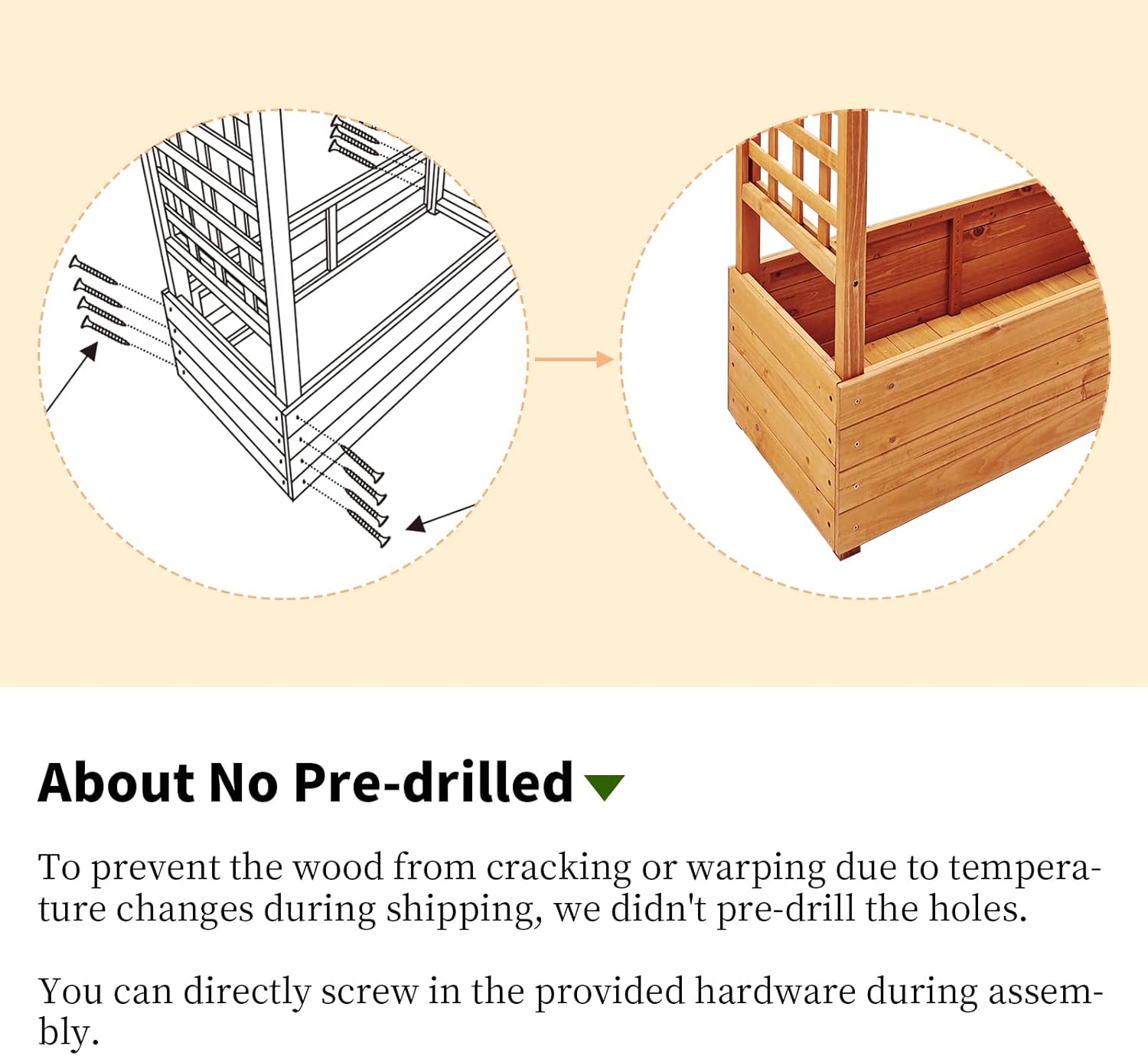 - 【Easy Assembly】 With fewer assembly parts, you can set up your raised garden bed with trellis in just 15 minutes. Follow the user manual for a hassle-free installation process. To prevent the wood from cracking or warping due to temperature changes during shipping, we didn’t pre-drill the holes. You can directly screw in the provided hardware during assembly.