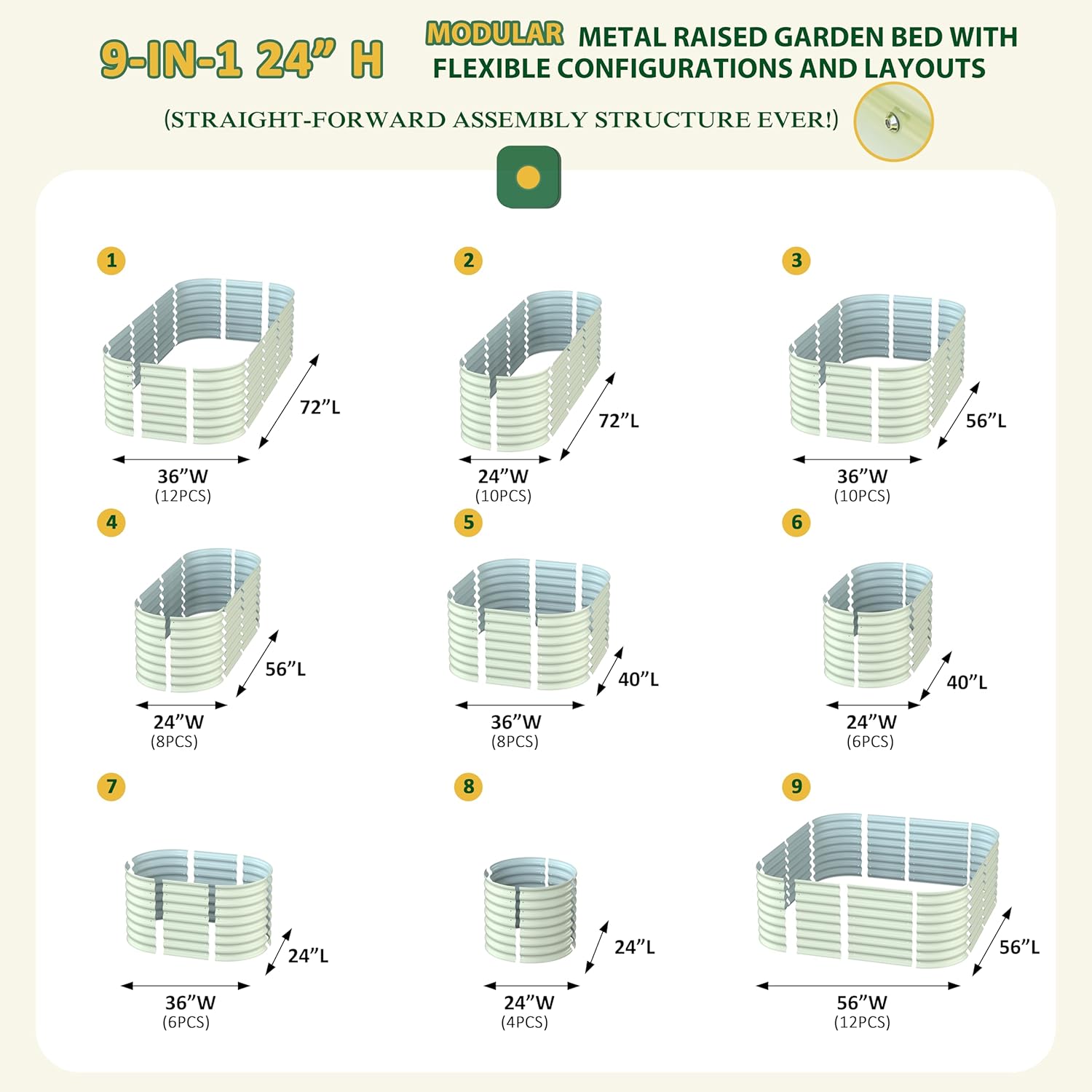 - 9-IN-1 CUSTOMIZE YOUR GARDEN - The garden planter box with 4 corner panels and 8 side panels for 9-in-1 modular kit, meaning you can modularize metal raised garden bed with flexible configurations and layouts. Owning this outdoor galvanized raised garden bed for vegetables, you can create a variety of options that perfectly fit your diverse planting ideas. This raised garden bed kit in pearl white color would be a great addition for your patio, porch, deck and garden.