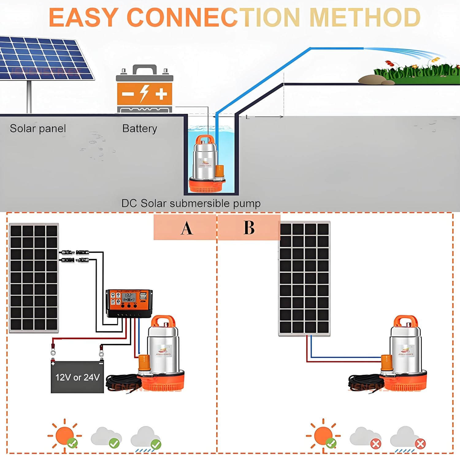 - 2. [Solar Energy/DC Power]: The solar powered sump pump can uses solar energy or battery power, which has a high energy conversion rate and low energy consumption.And providing an additional solar controller can better protect your battery!