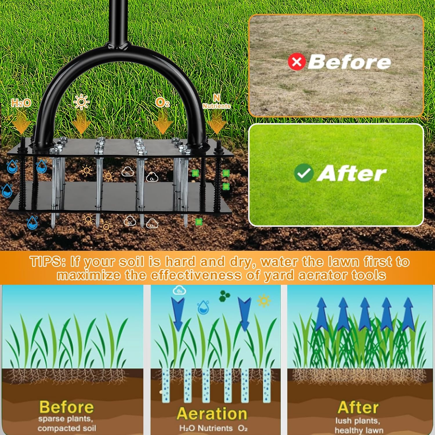 - 【Soil Aerator Ideal for Lawn, Garden & Backyard Use】Whether you're loosening hardened patches, prepping for overseeding, or revitalizing tired turf, this lawn air aerator tool delivers consistent results across various yard and garden scenarios. This lawn aerator tool (grass aerator for lawn) excels in diverse applications.