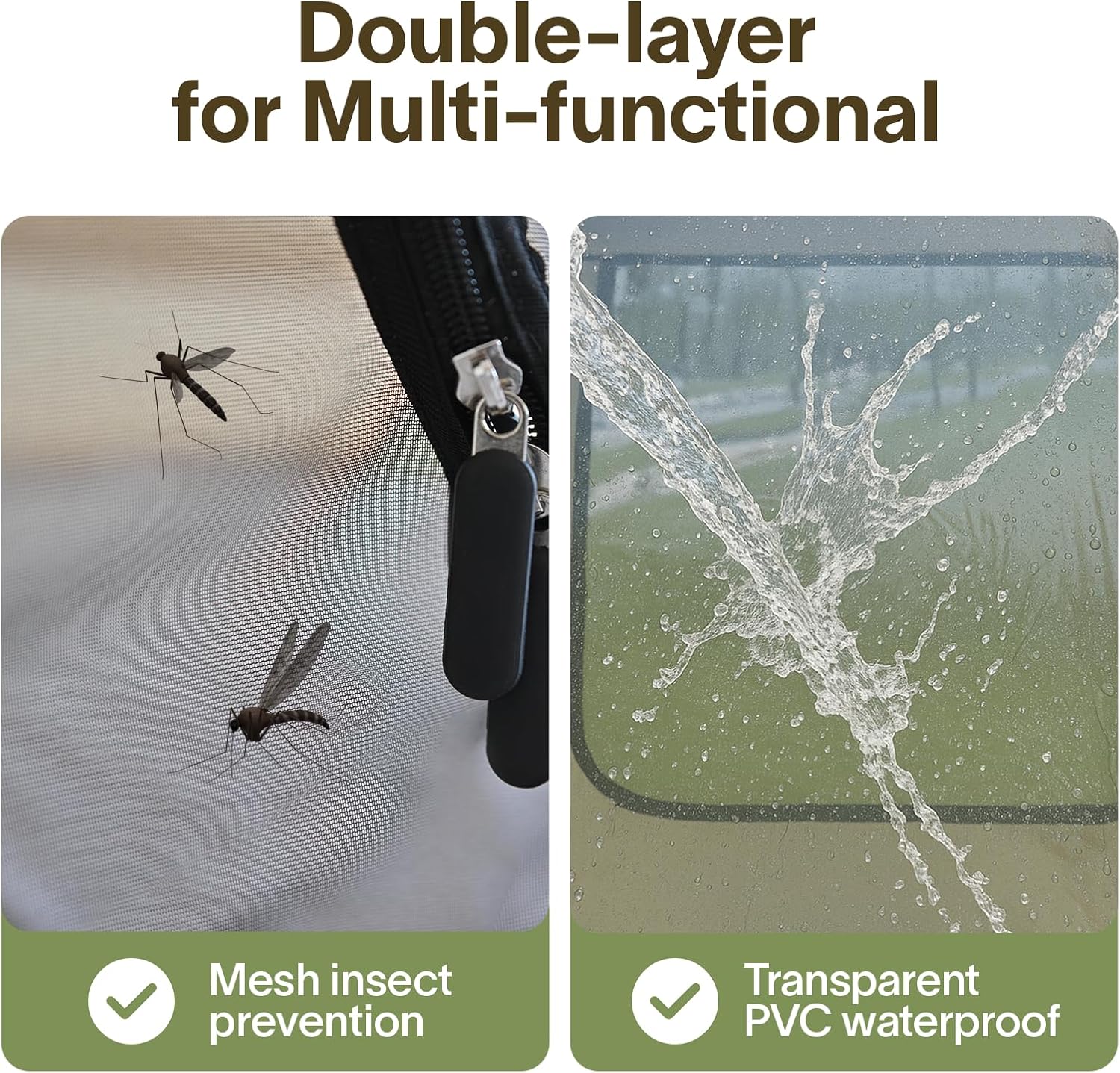 - All-Weather Ready: Built for all four seasons, this pop up tent shields you from rain, wind, and insects. Use the mosquito-proof mesh for breezy backyard lounging or rely on the waterproof PVC layer for storm protection—versatility meets durability. And the built-in fabric side doubles as a sunshade sail—no extra purchase needed! Block sunlight, prevent sunburn, and enjoy added privacy.