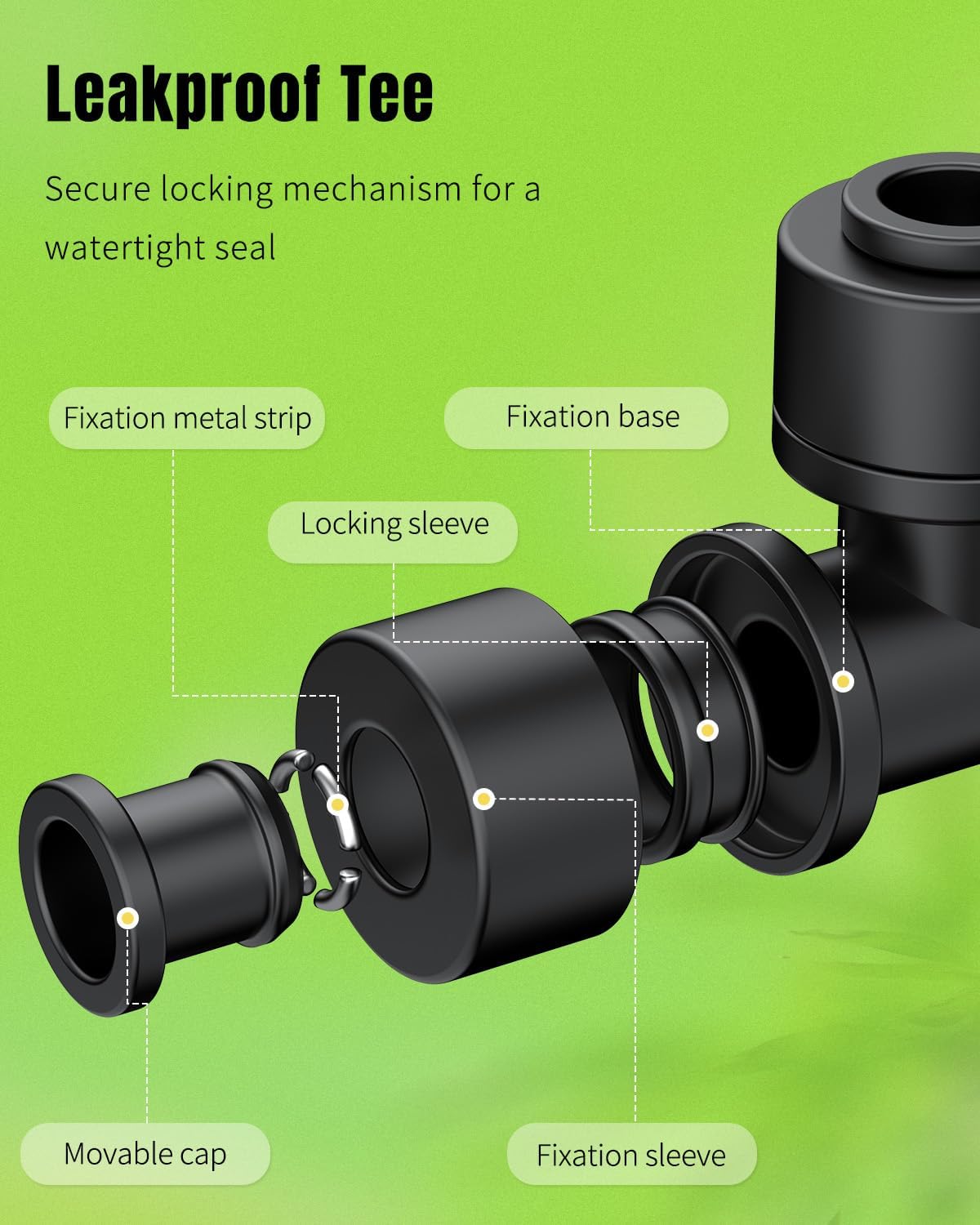 - Leakproof Tees: Secure locking mechanism inside creates a watertight seal with your tubing. No worries about disconnection or leaks! Always ensure efficient water delivery across your land. (NOTE: For best results, keep the tubing cut clean and straight.)