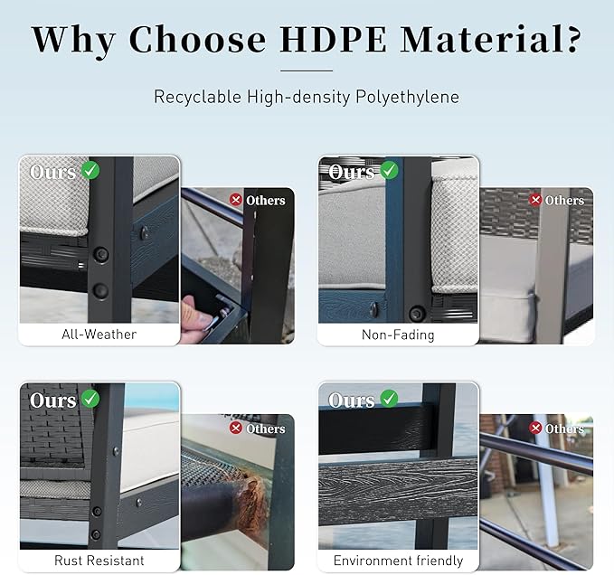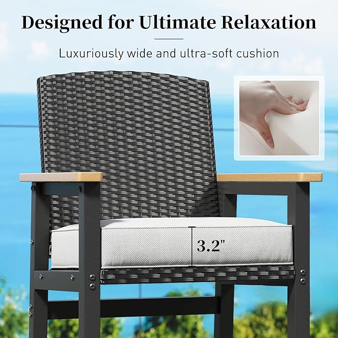 - STURDY BAR SET: Our bar set is made of High Density Polyethylene (HDPE) recyclable material, which is durable, low maintenance and environment friendly. The extra wide 19.7" seat is designed with 3.2" thick cushion, with ergonomic wicker backrest and wood-grain armrests, provide a comfortable and luxurious seating experience at all times