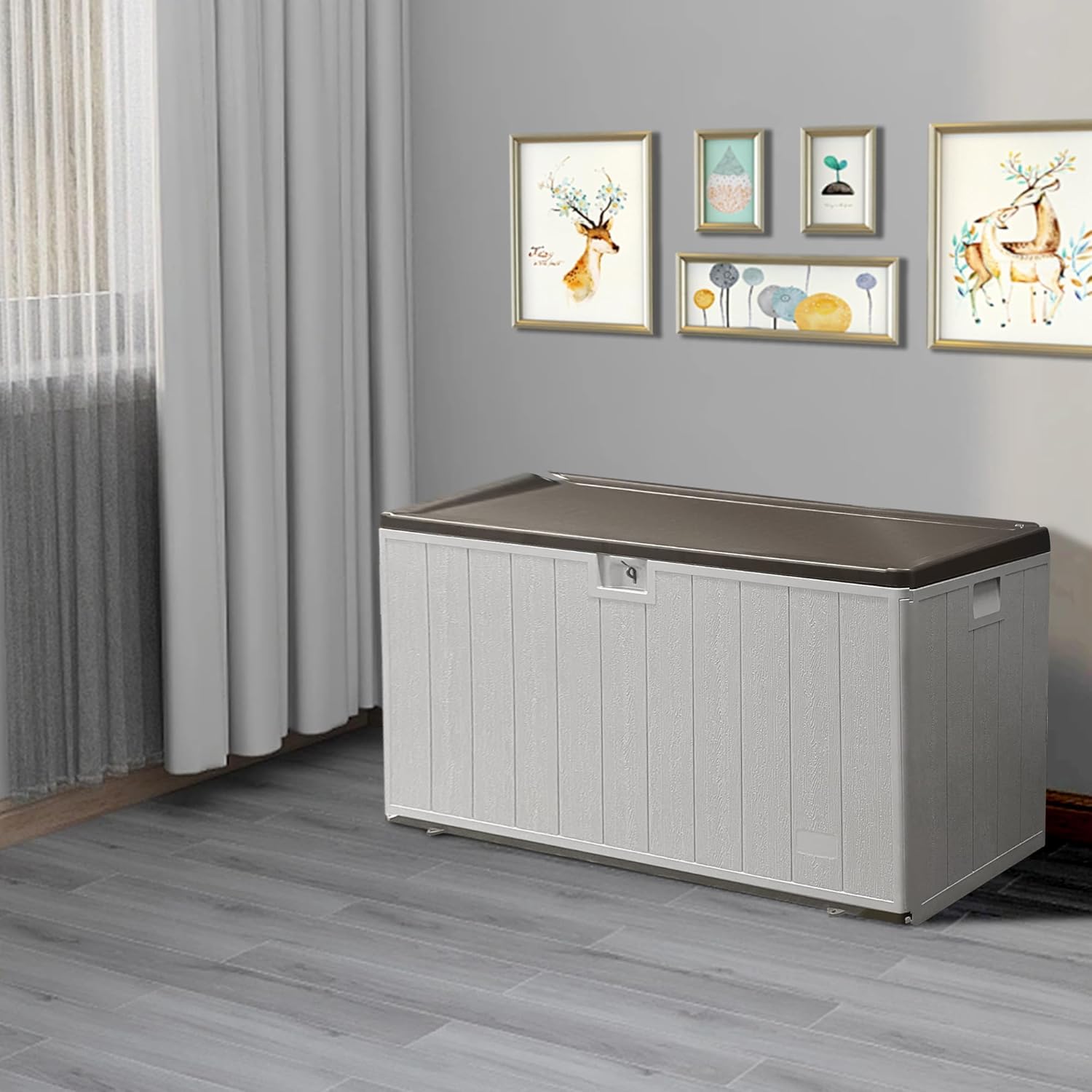 - This deck box is as stylish as it is functional, seamlessly blending with any outdoor décor. Whether your space is modern or classic, it adds a touch of sophistication while providing ample storage. Its clean, timeless design enhances the look of your patio, garden, pool area, or even indoor spaces, making it the blend of form and function.