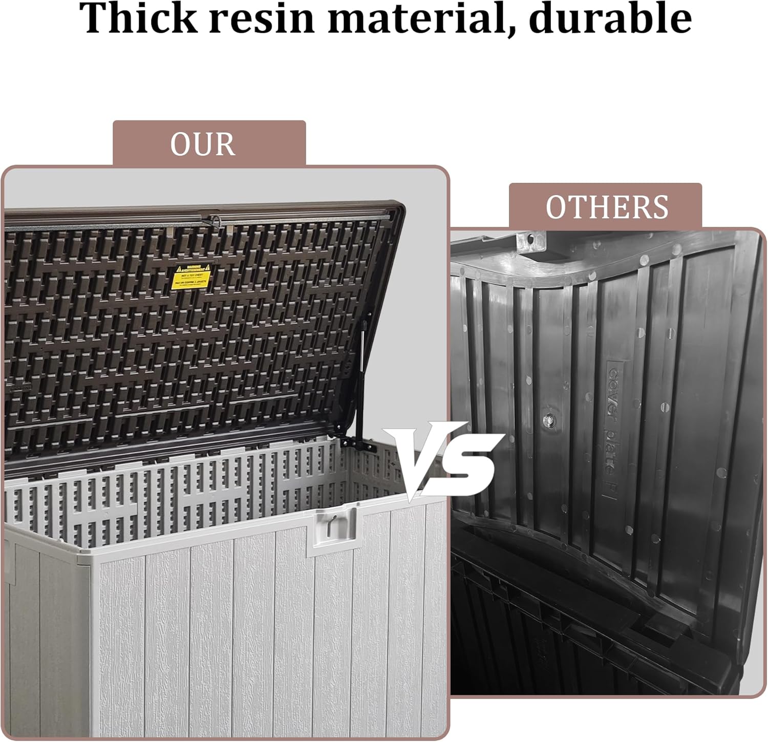 • Weatherproof Resin for Year-Round Use. Durable, waterproof resin, this deck box resists rain, sun, and UV exposure. Ideal for all-season use, it won’t peel, rust, or warp like wooden or metal boxes—keeping your items protected outdoors.