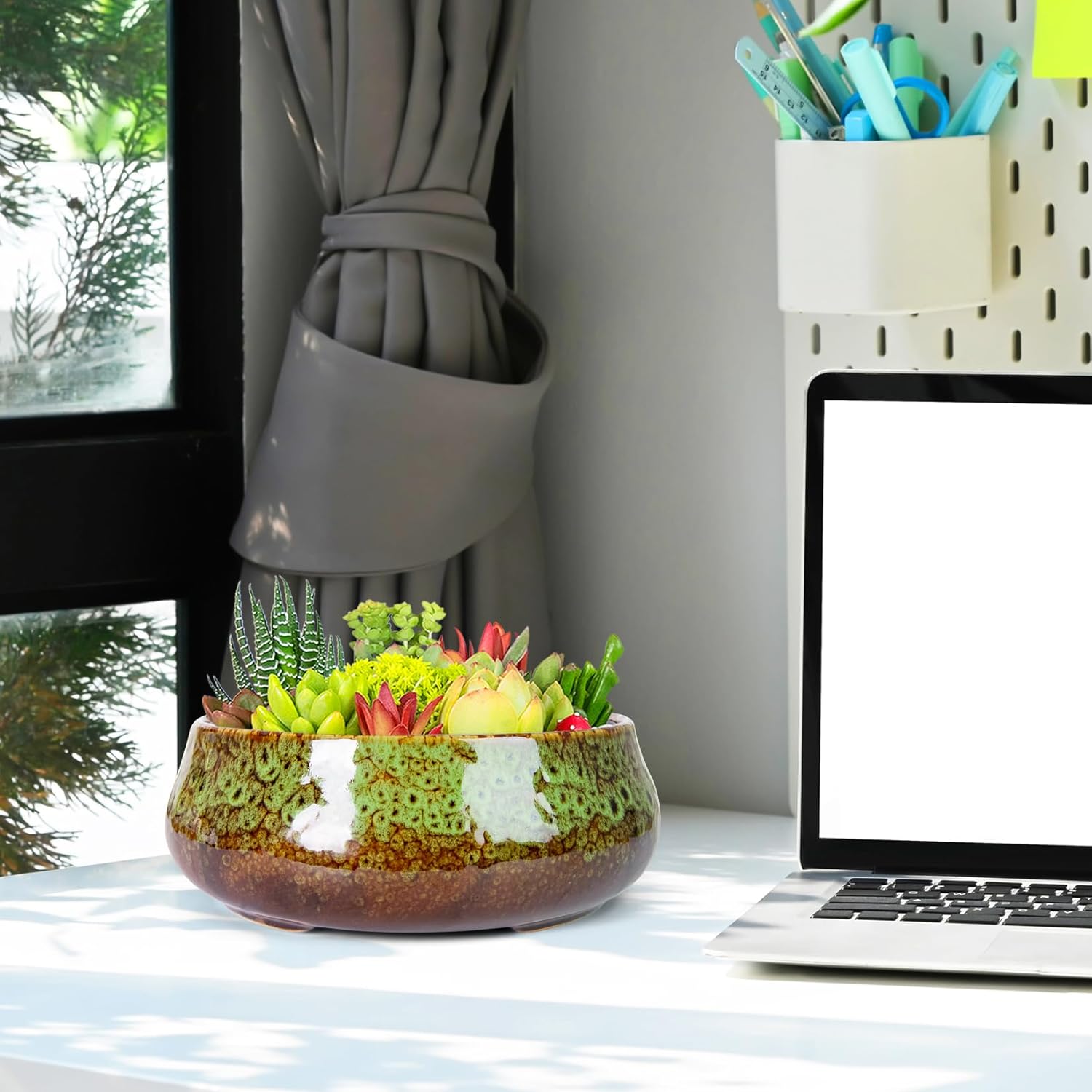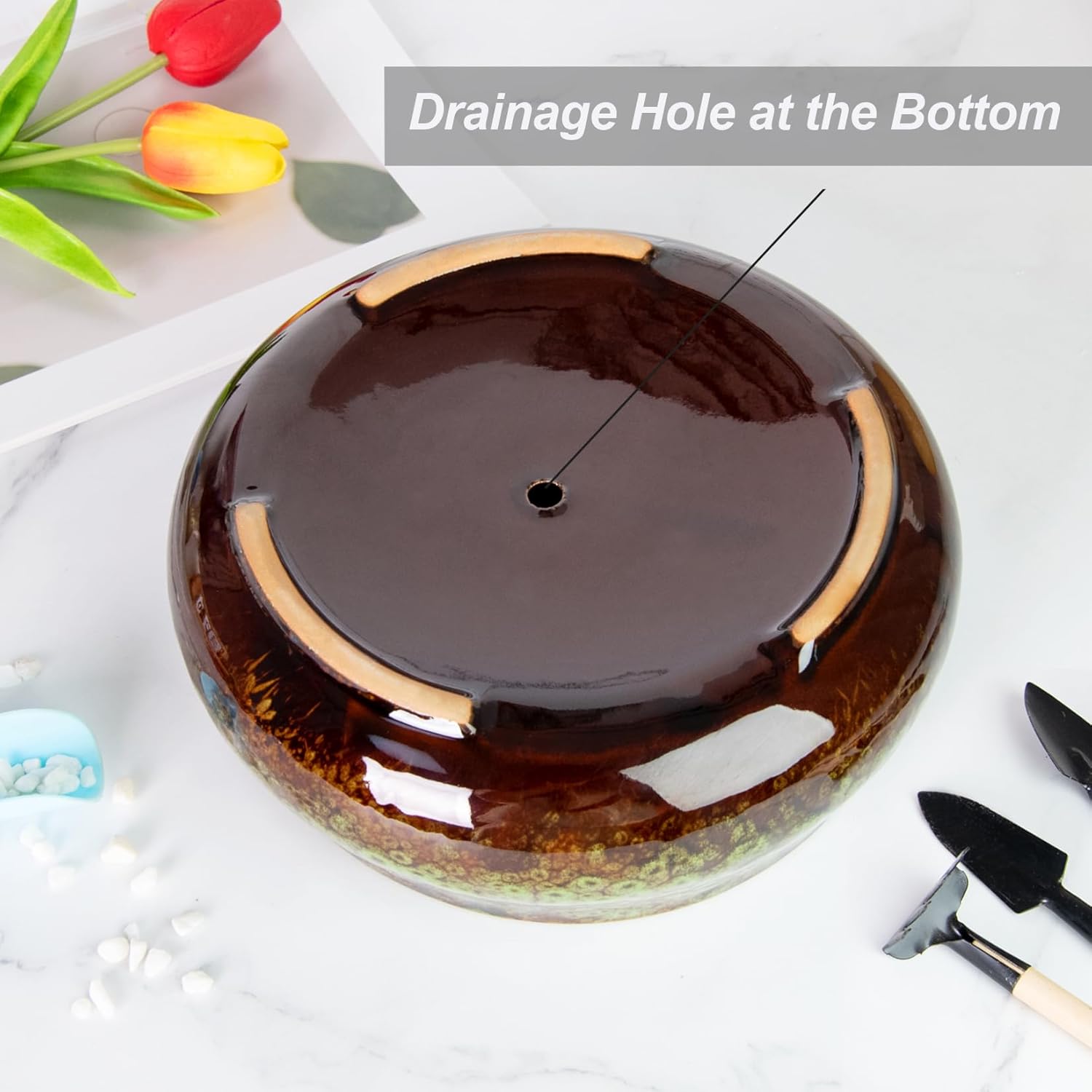 ARTKETTY Succulent Pots - 8 Inch Plant Pot, Large Bonsai Pots with Drainage, Ceramic Planters for Indoor Outdoor Plants, Round Shallow Cactus Flower Plant Container Bowl Decorative Home Garden
