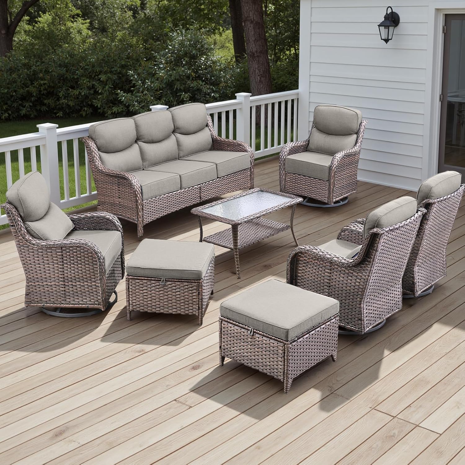 Wicker Outdoor Patio Furniture Set - 8 Piece Patio Conversation Sets with Swivel Rocker Chairs, Ottomans, Sofa and Table, 6 inch Cushions, Deep Seating, for Porch Deck Brown/Beige